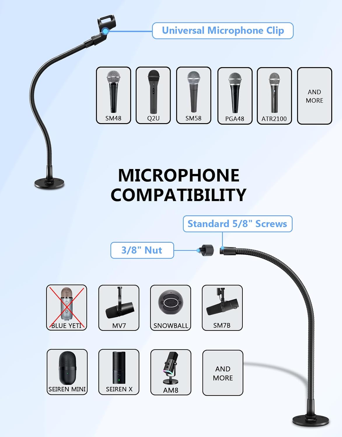 **Ultra-Flexible 360° Positioning** Crafted from durable alloy steel, this gooseneck microphone stand features a 19-inch bendable arm that can be angled at will and can be secured without sagging. It’s perfect for holding microphones in the studios, classrooms, or home audio setups—ideal for podcasters, educators, and musicians.