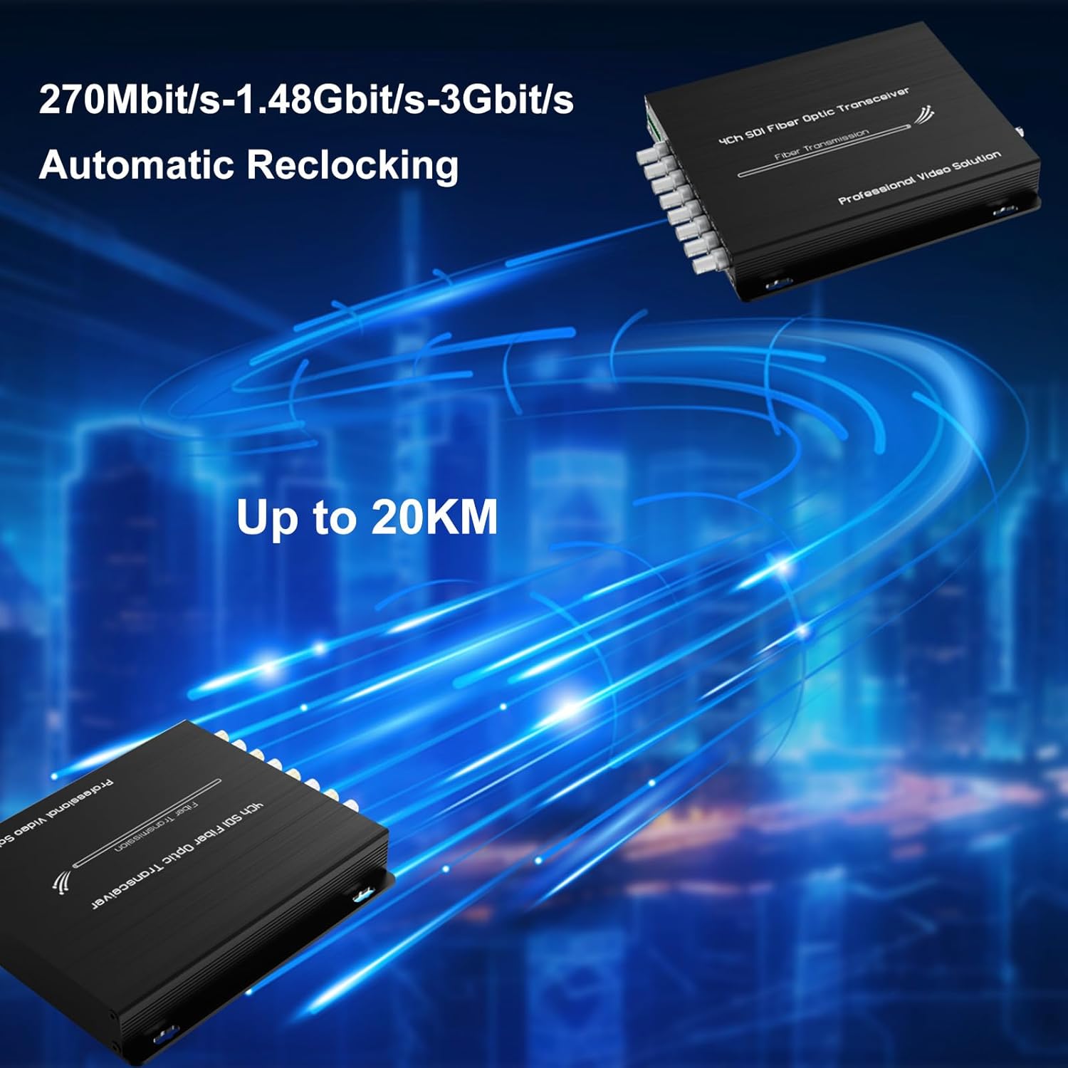 [60Hz, 3Gbit/s]—The Fiber Converter supports 1080P@60Hz resolution ratio and automatic reclocking 270Mbit/s-1.48Gbit/s-3Gbit/s, It can transfer full digital non-compression broadcast level video.