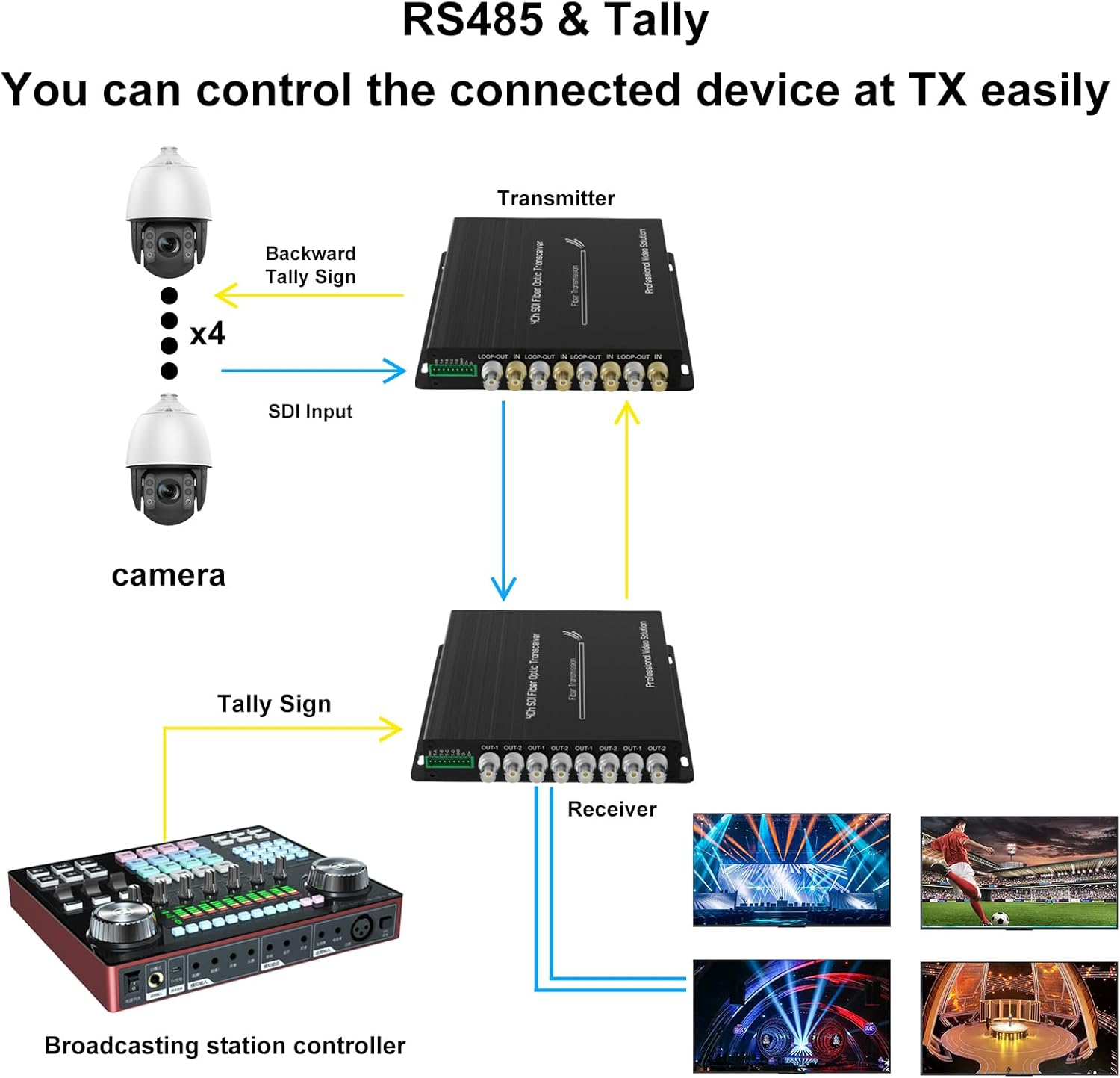 [RS485 & Tally]—It has Tally signal interface (compatible with RS485 data), supporting backward tally signal transmission. You can control the connected device easily by using Tally Function at the RX.