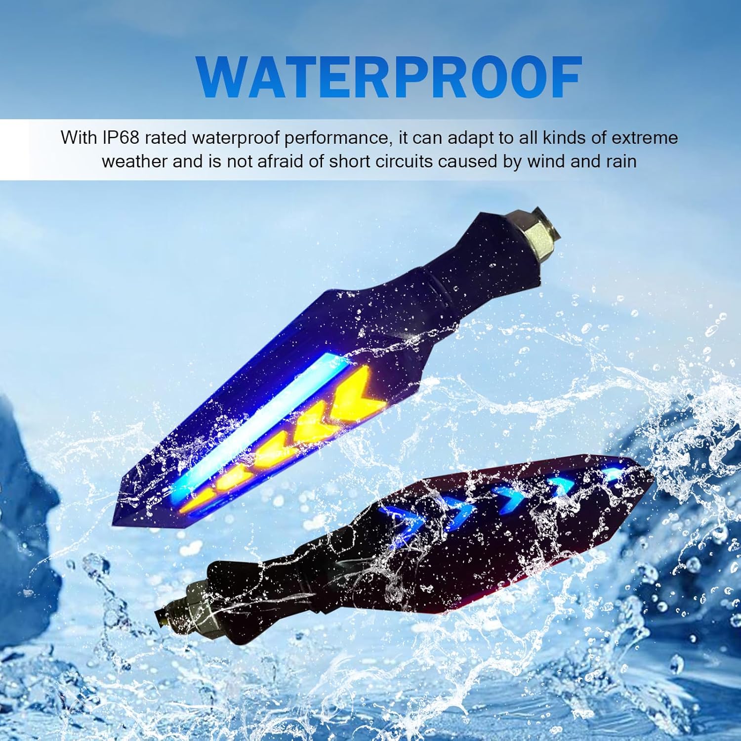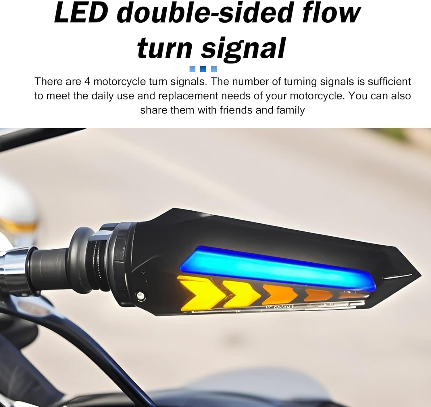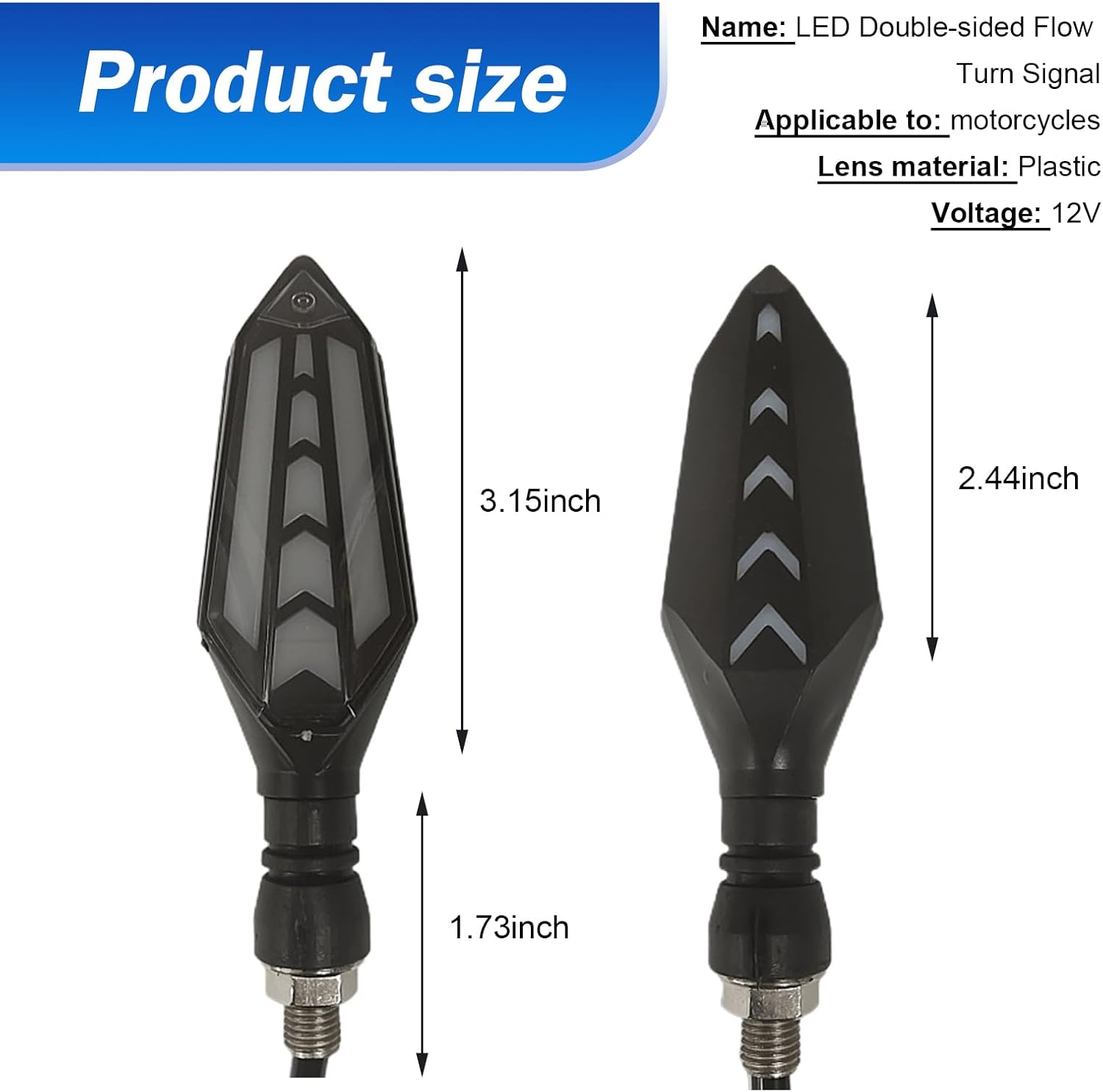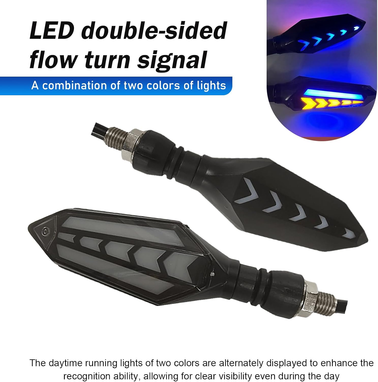 – This double-sided flowing turn indicators with daytime running lights, double color and IP65 waterproof design, the light wattage is 12V, and this mini motorcycle turn signal lights is compatible with most motorcycle models.