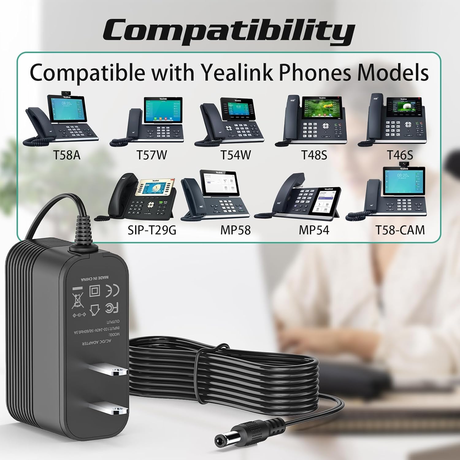Compatible with: the replacement charger for Yealink Phone compatible with Yealink Phone T54W, T46U, MP54, MP56, T57W, T46S, T48U, T53W, SIP-T38G, SIP-T46G, SIP-T48G, SIP-T29G, SIP-T32G, SIP-T5XX, T48S, T58A, T58-CAM, PS5V2000US and CP860 for IP phones models