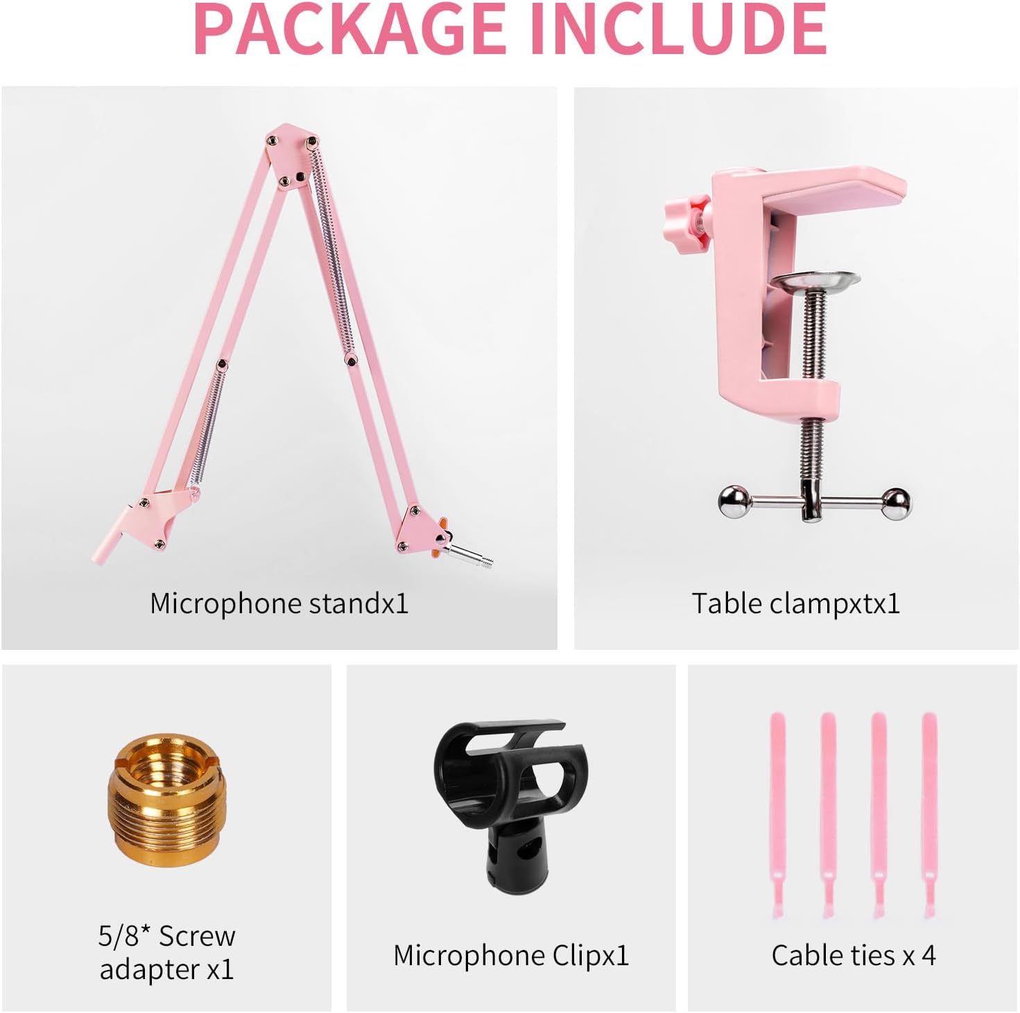 【Package】1 x Microphone stand, 1 x 5/8* to 3/8* Screw adapter, 1 x Microphone Clip, 1 x Table clamp, 4 x Cable tie. Note: Not Included Microphone.