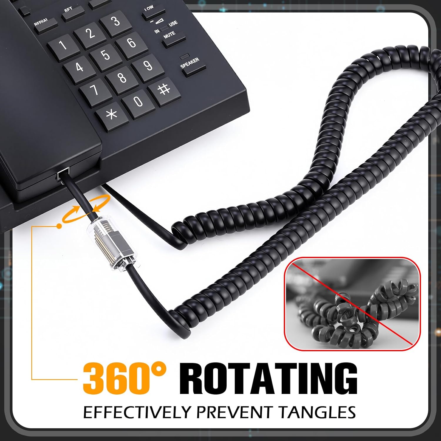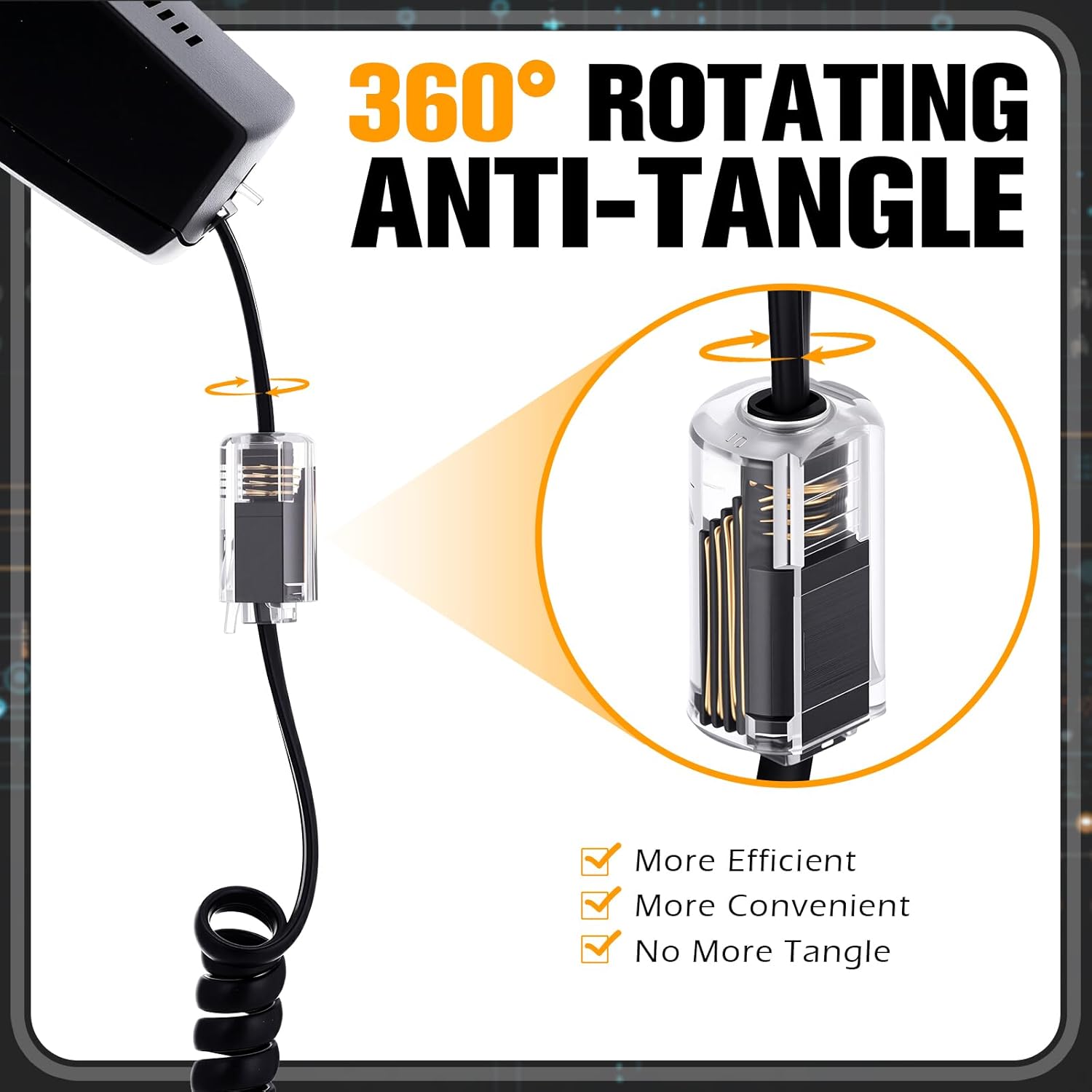360° Rotating Anti-Tangle Cord: The phone cord detangler smoother automatically rotates 360 degrees, effectively preventing the curled telephone cord from being entangled and messed up, plug and play, no complicated operation required