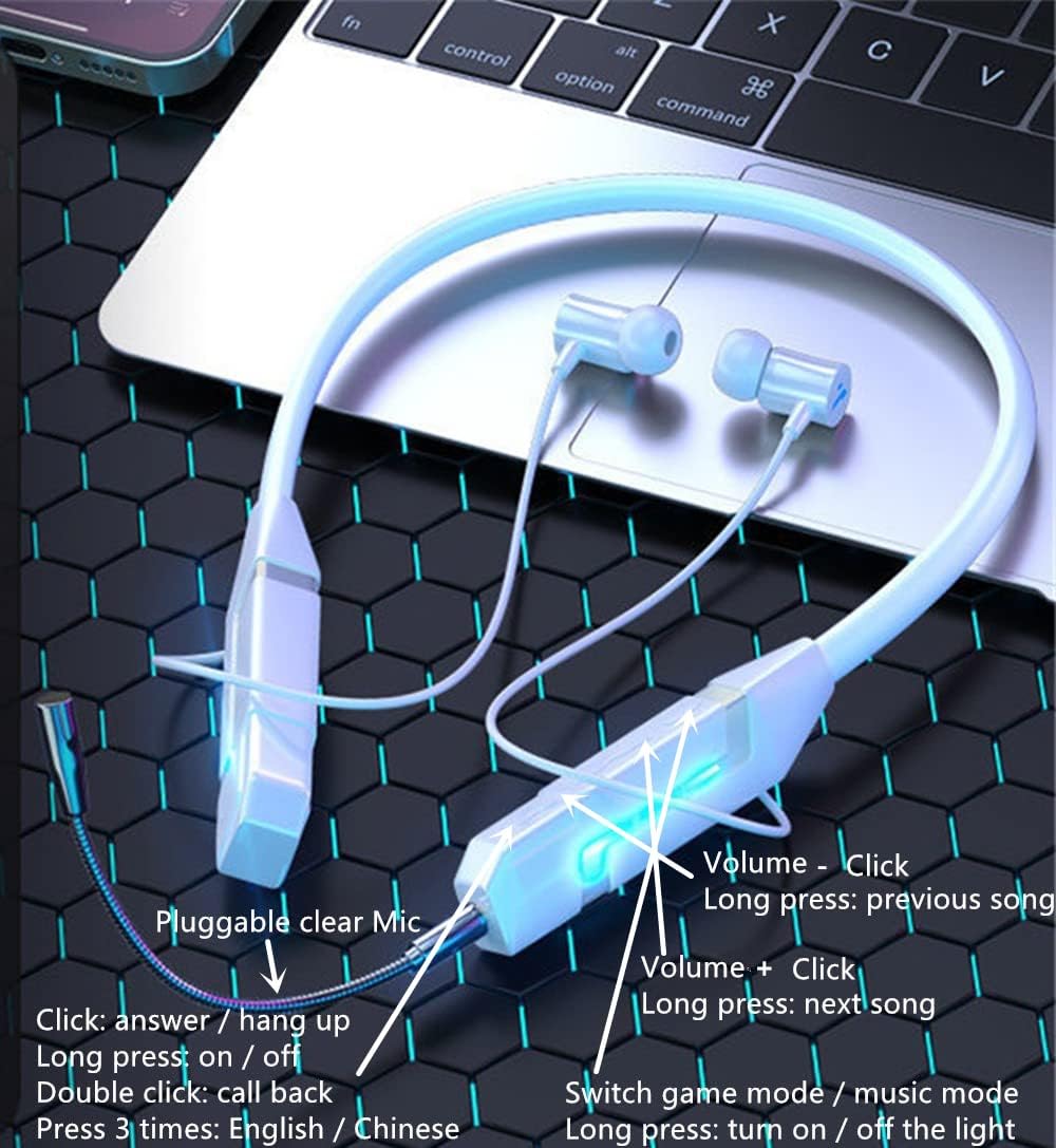 72Hours of Playtime, Pluggable Mic, Glowing Neck Hanging, Sweatproof Waterproof. Powerful power reserve, 72 hours playtime of continuous gaming or music. Pluggable HD microphone with voice control across the board. Silicon microphone with high audio sampling rate, true HD calls. Dazzling flowing light, neck hanging design for gaming, sports, running, GYM workout. No fear of sweating, sound quality is always the same. Fully enclosed sound cavity to prevent sweat and rain from penetratin