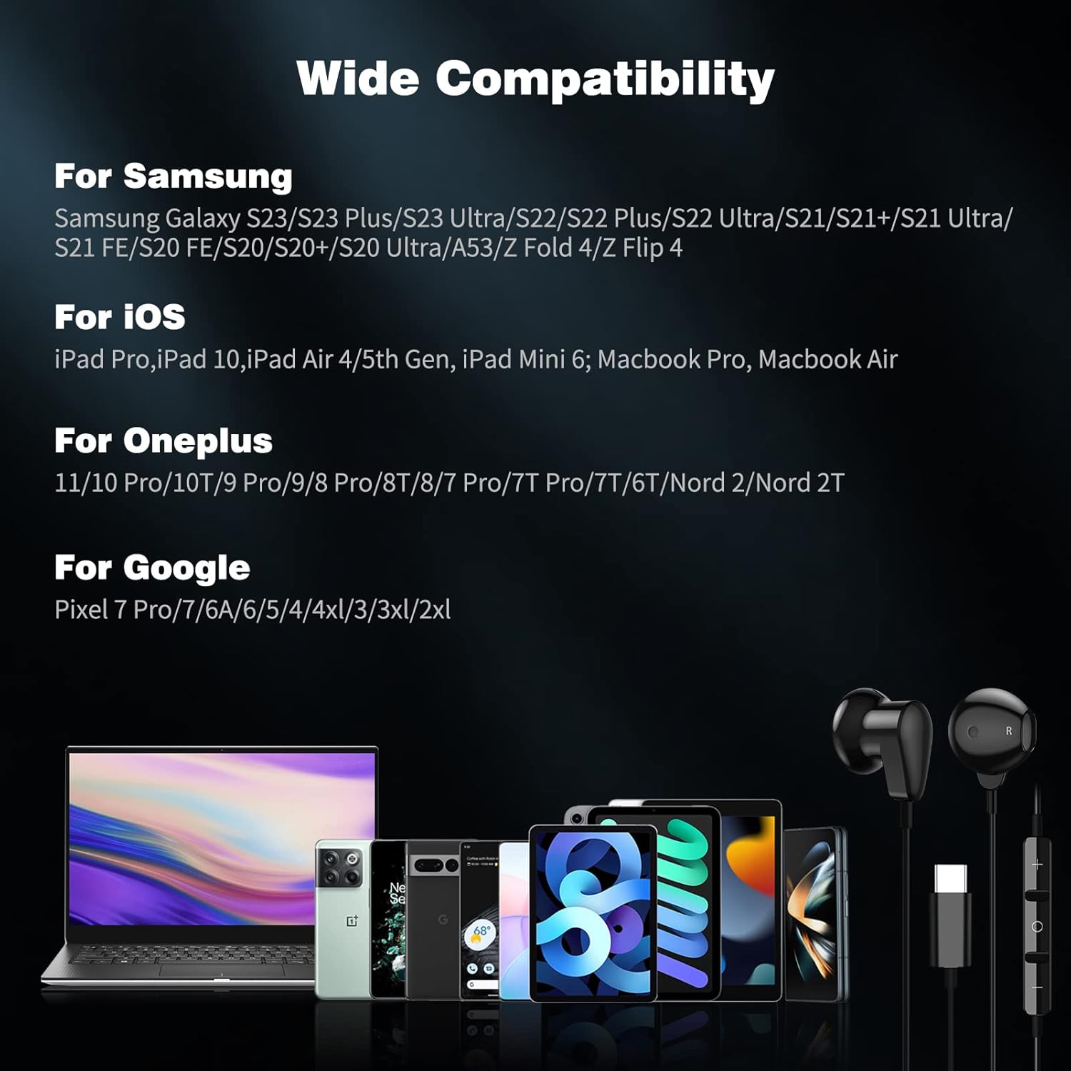 For Samsung Galaxy S24/S24+/S24 Ultra/; S23 Ultra/S23 Plus/S23 FE/S23; S22 Ultra/S22 Plus/S22; S21 Ultra/S21+/S21; S20 Ultra/S20+/S20/S20 FE; Note 20 Ultra/Note20; Note 10/Note 10+ For Samsung Galaxy A53 / A54 / A35 / A33 / A90 / Z Fold 6 / Z Flip 6 / Z Fold 5 / Z Flip 5 / Z Fold 4 / Z Flip 4 / Z Fold 3 / Z Flip 3 / Z Flip / Tab S9 / Tab S9 Plus / Tab S9 Ultra / Tab S8 / Tab S7 /Tab S6 / Tab S5e For iPhone for iPhone 16 / 16 Plus / 16 Pro / 16 Pro Max/ iPhone 15 / 15 Plus / 15 Pro / 15 Pro Max For iPad iPad Pro 2024(M4) / iPad 10 / iPad Pro 2022(M2) / for iPad Mini 6 / for iPad Pro 3/4/5th Gen/ for iPad Air 4th/5th Gen For Google Pixel 9 Pro / 8 Pro / Pixel 8 / Pixel 8A / Pixel 7 Pro / Pixel 7 / Pixel 7A / Pixel 6 Pro / 6A / 6 / Pixel 5 / Pixel 4 / Pixel 4 XL / Pixel 3 / Pixel 3 XL / Pixel 2 XL / Pixel Fold / Pixel Tablet For MacBook for MacBook /for MacBook Air /for MacBook Pro 2023/2020/2019, for iMac /for iMac Pro /for Mac mini For Oneplus for Oneplus 12 / Open / 11 / 10 Pro / 10T / 9 Pro / 9 / 8T / 8 Pro / 8 / 7T Pro / 7T / 7 Pro / 7 / 6T / for OnePlus Nord 2 / Nord For Motorola for Moto Razr 40 Ultra 2023 / Razr 40 2023 / Razr 2 / Razr, for Motorola Edge (2021/2022) / for Motorola Edge+(2022/2023) / for Motorola Edge 30 / Edge 30 Pro For Nokia 9 PureView / Nokia 8 Sirocco / Nokia 7 Plus / X71 / 7 / X7 / X6 / X5 For Sony Xperia 1 / Xperia XZ3 / XZ2 Premium / XZ2 Compact / XZ2 / Xperia XA2 Ultra More Compatible If you are not sure whether your device is compatible with this type-c earphones or not, pls leave a message before purchasing