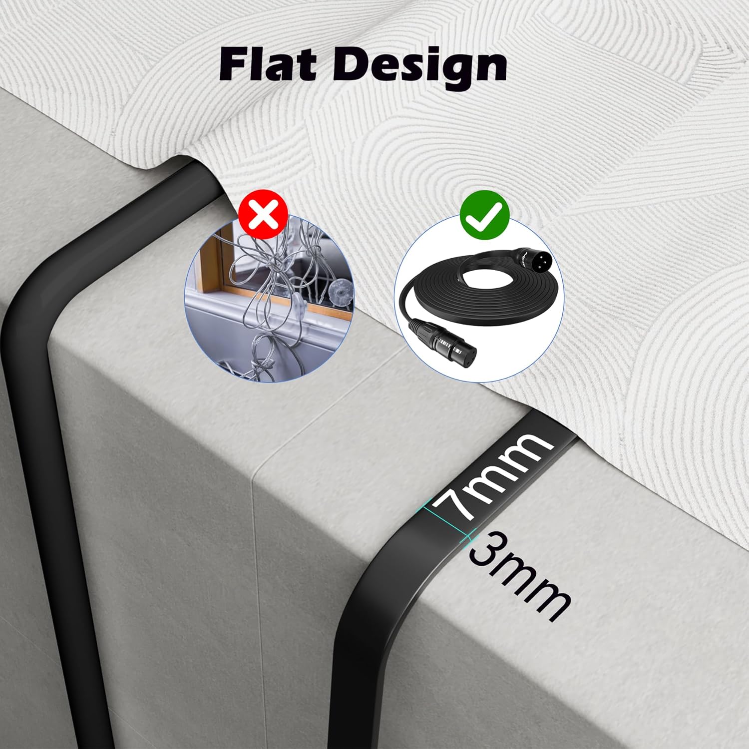 Our Advantages: Flat cable design for easier floor/wall routing, reducing tripping hazards and keeping installations neat – prevents tangling—-Nickel-plated connectors withstand repeated plugging/unplugging, extending interface lifespan (over 10,000 cycles)—-High-elasticity eco-friendly PVC jacket (RoHS compliant) for safer use—-3.5mm*7.2mm profile combines slimness with durability – pull-resistant and tangle-free for frequent repositioning—-XLR locking mechanism ensures smooth connection with secure locking for uninterrupted signal transmission