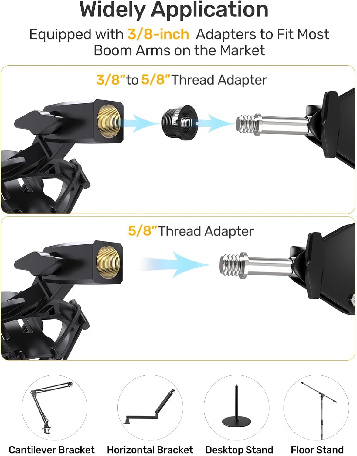 [Easy to Adjust, Highly Compatible] This shock mount for AT2020 mic holder lets you tweak the angle effortlessly with its adjustment knob. It’s a breeze to take on and off, and fits perfectly with 3/8″-16 and 5/8″-27 threaded stands – no hassle, just smooth setup.