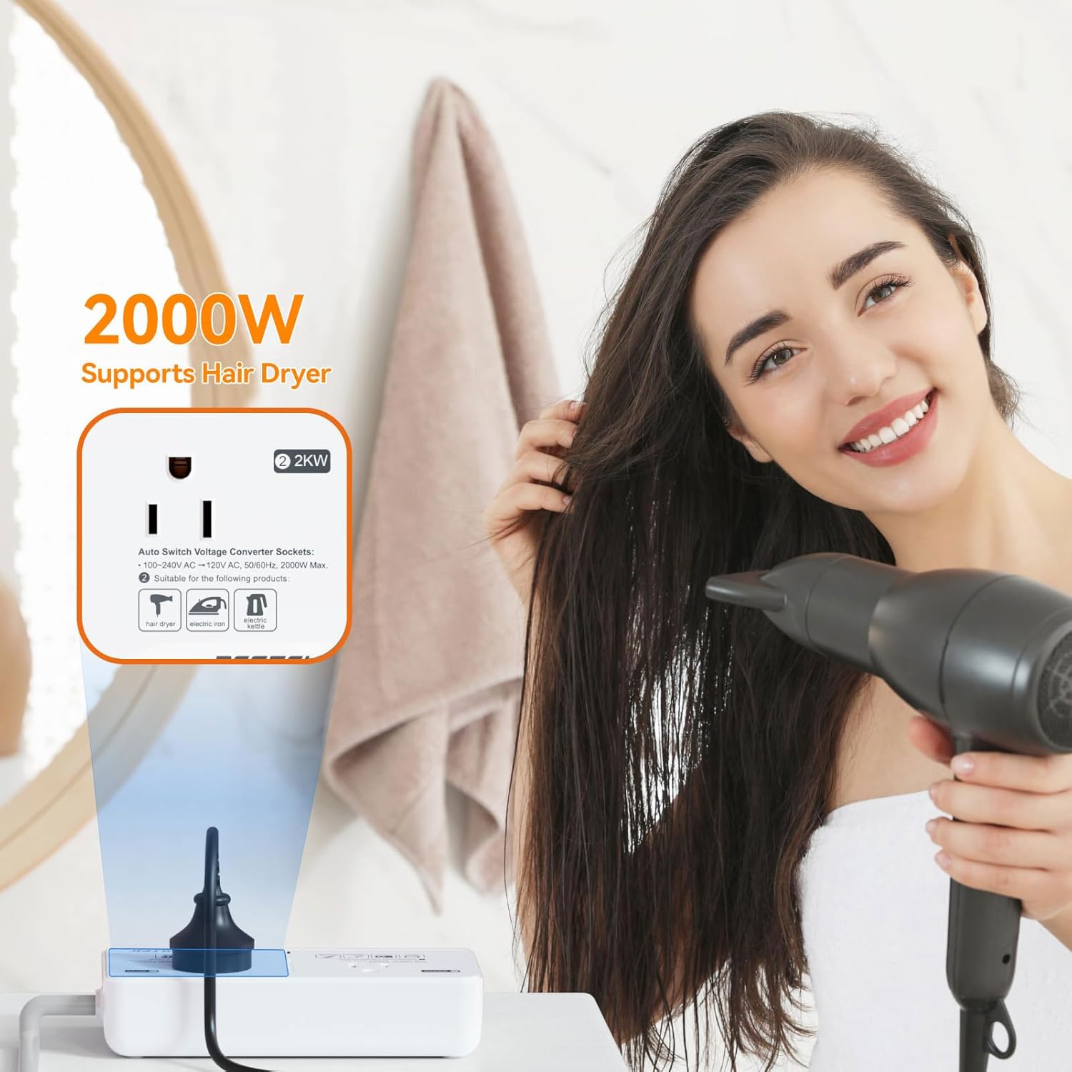 BETSEK’s upgraded power converter can meet your charging needs for multiple devices. This converter has 2 separate sockets. One of the AC outlets converts voltage from 100-140V or 200-240V to 120V, providing a powerful 2000W power, designed for American devices such as hair dryers, electric kettles, and flat irons. The other AC outlet supports wide voltage 100-240V input devices with a maximum power of 200W, which is ideal for low-power devices such as laptops, mobile. Perfect for Most Travel DevicesPerfect for Most Travel Devices