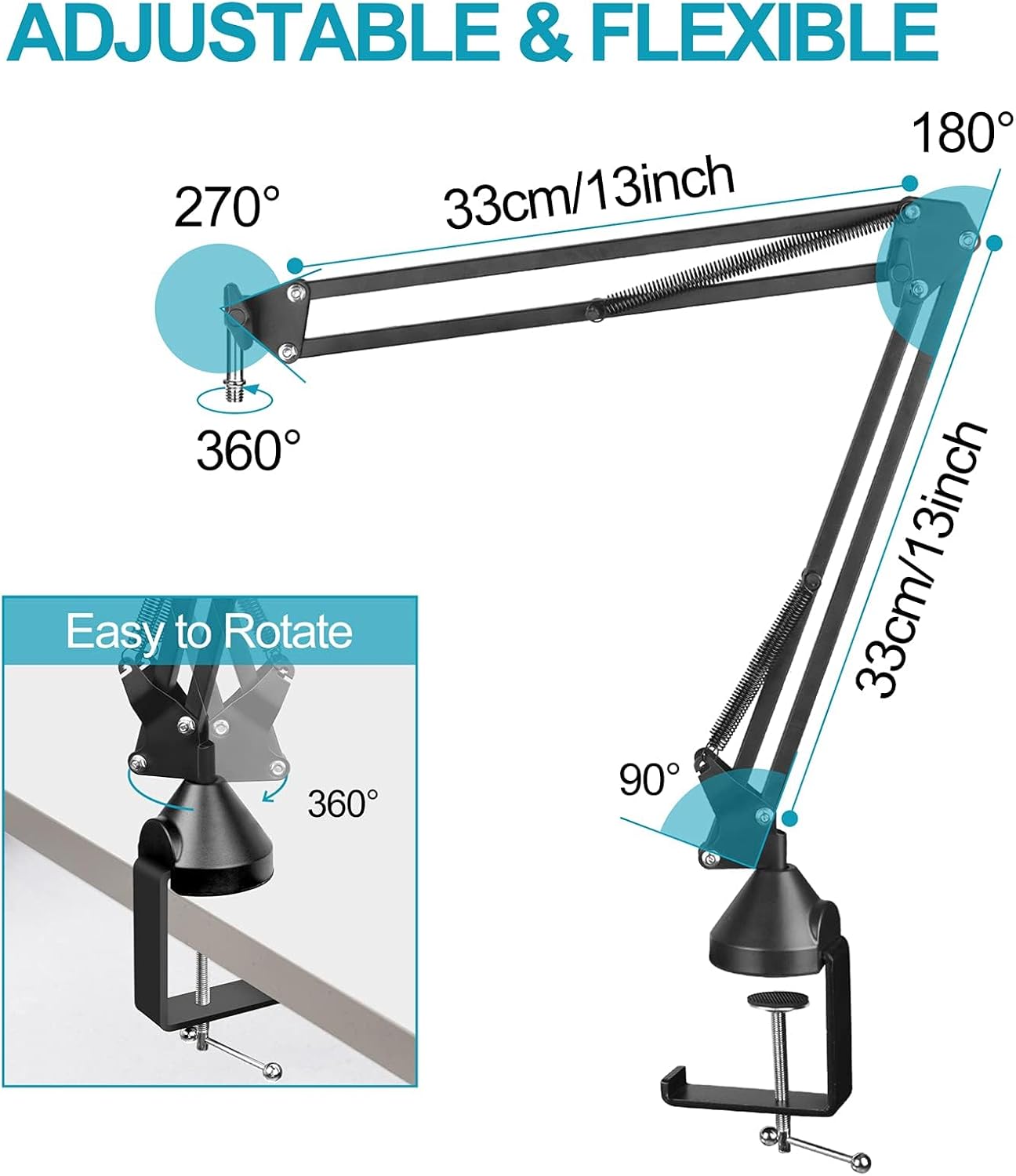 • Boom Arm, Mic Arm Adjustable Microphone Arm with 2 Clips and Pop Filter, Mic Stand Desk with 3/8″ to 5/8″ Adapter for Blue Yeti Nano Snowball Ice, HyperX QuadCast, Recording, Gaming, Streaming
