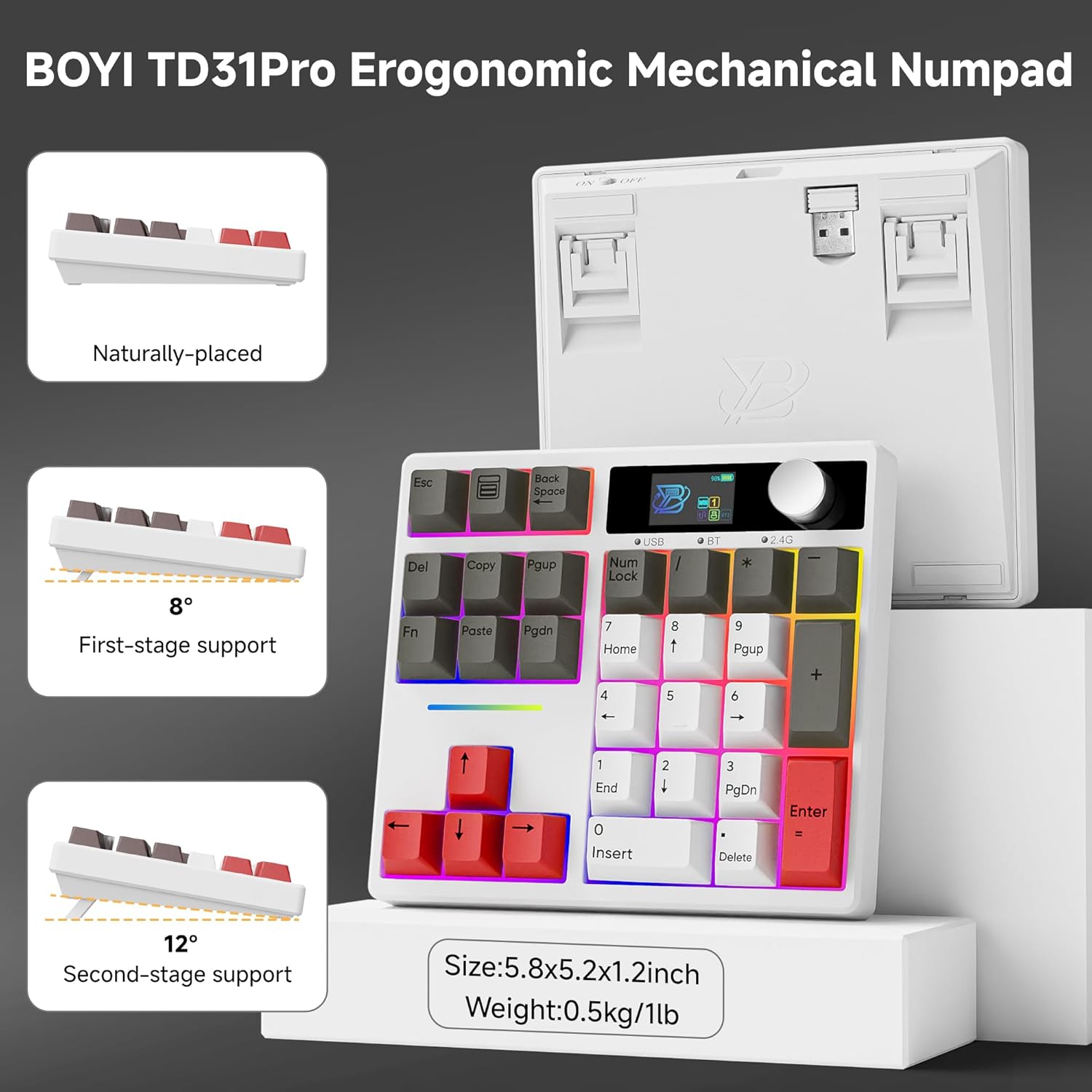 • BOYI TD31Pro Mechanical Number Pad,Bluetooth5.0/2.4G/Type-C Wireless Numeric Keypad,RGB HotSwap Numpad with Screen&Knob,PBT Keycaps Rechargeable Gasket Number keypad for Working/Gaming(White-Grey)