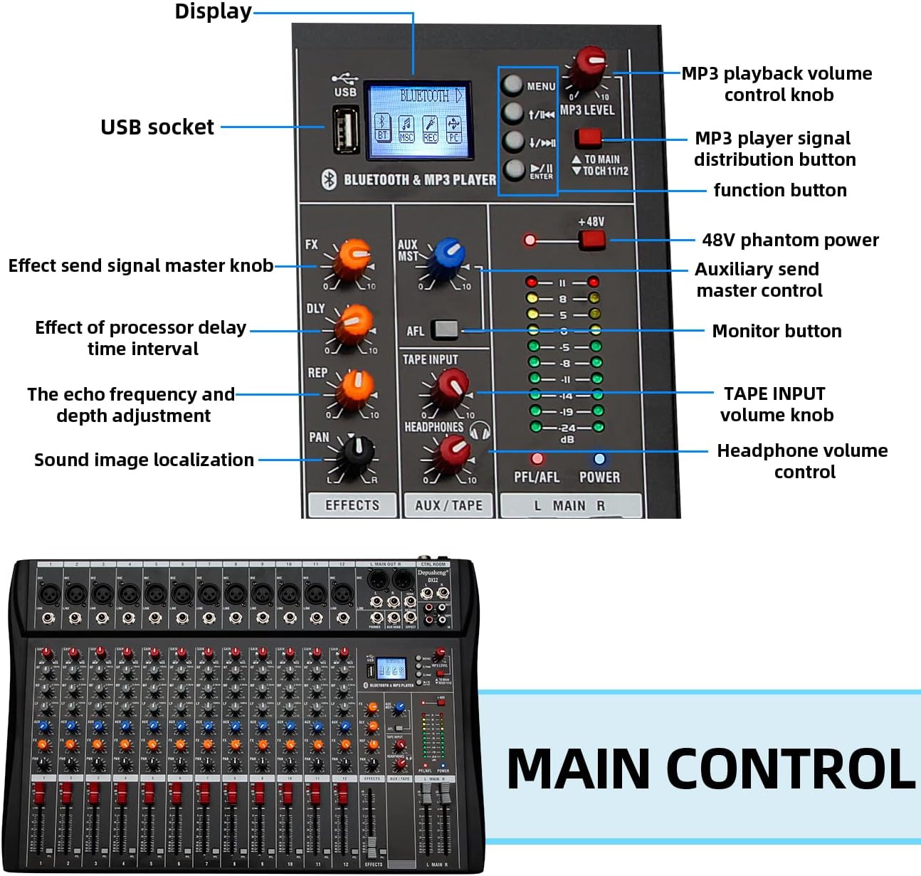 Multi Devices Compatibility:This portable 12-channel DJ mixer has Bluetooth for wireless streaming and use it as an input to mix signal with other input channels. It works with IOS, Android, Tablet and MP3 Player
