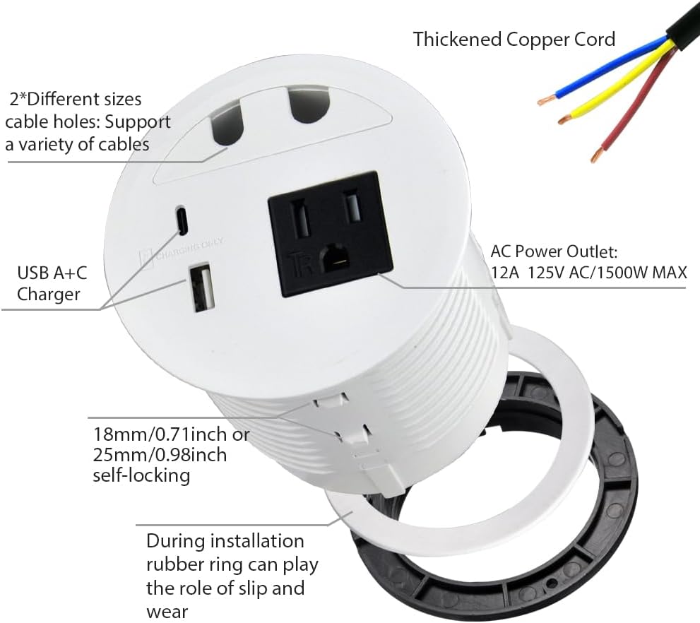 Desktop Grommet Charging Receptacle: Power Output: 125V/12A/1500W. 1xUSB-A+C (max 33w), 1x US Power, 2x cable holes with a 4.5ft(16AWG) Extension Cord.