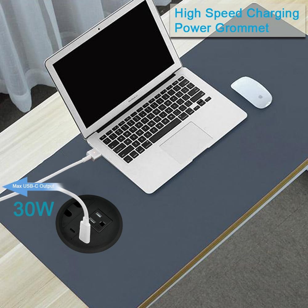 Desktop Grommet Charging Receptacle: Power Output: 125V/12A/1500W. 1xUSB-A+C (max 33w), 1x US Power, 2x cable holes with a 4.5ft(16AWG) Extension Cord.