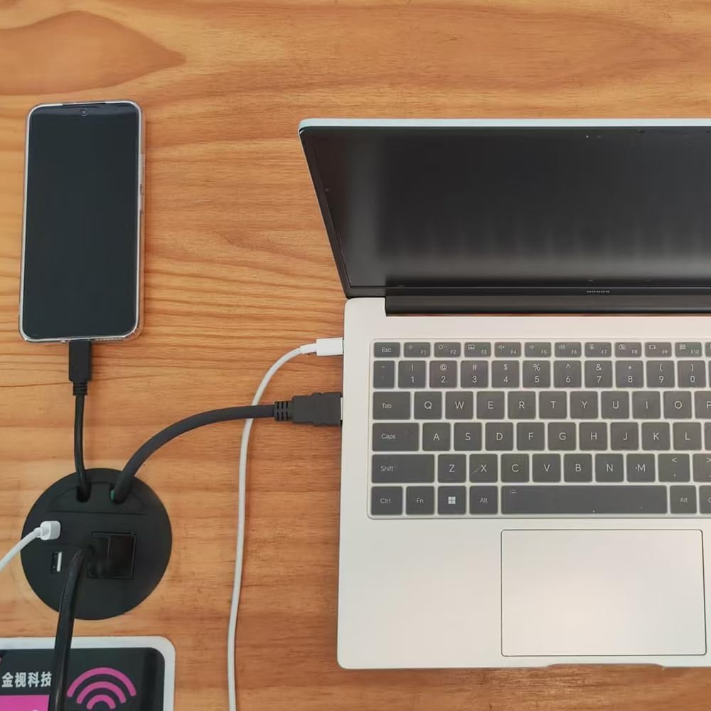 EASY INSTALLATION: Round design Recessed USB Outlet mounts to desktops, countertops, and adjustable tables; 3.15-inch diameter hole is required for installation; device size (without flange): 3.09-inch diameter × 3.54-inch depth