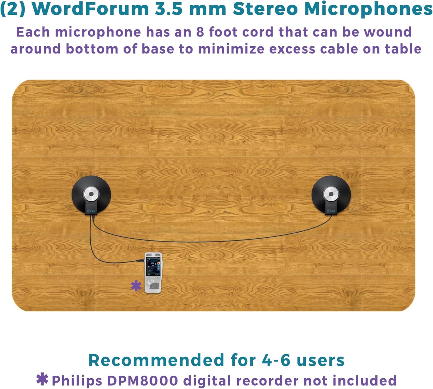 Includes (2) WordForum 3.5mm TRS stereo conference microphones with 8 foot cord in zippered carrying cases