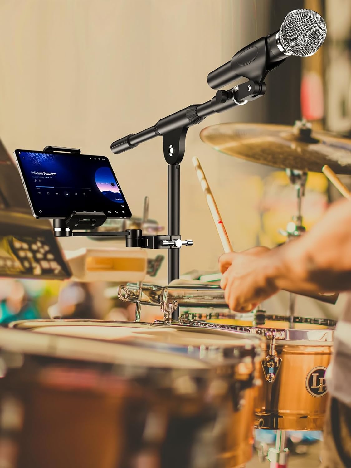 【iPad Mic Stand Holder】Aluminum built iPad holder is compatible with all 4-13 inch iPad, Android tablet and cellphone. Combined with the 8.5in adjustable long arm, it allows easy mounting of your iPad to any position & angle to the microphone stand, boom, music stand, hi-hat stands and more. With a built in 1/4”-20 camera threaded hole, this iPad tripod mount is attachable to your tripod directly. Use it when playing and sharing music in choir class, wedding, concerts, party, meetings.