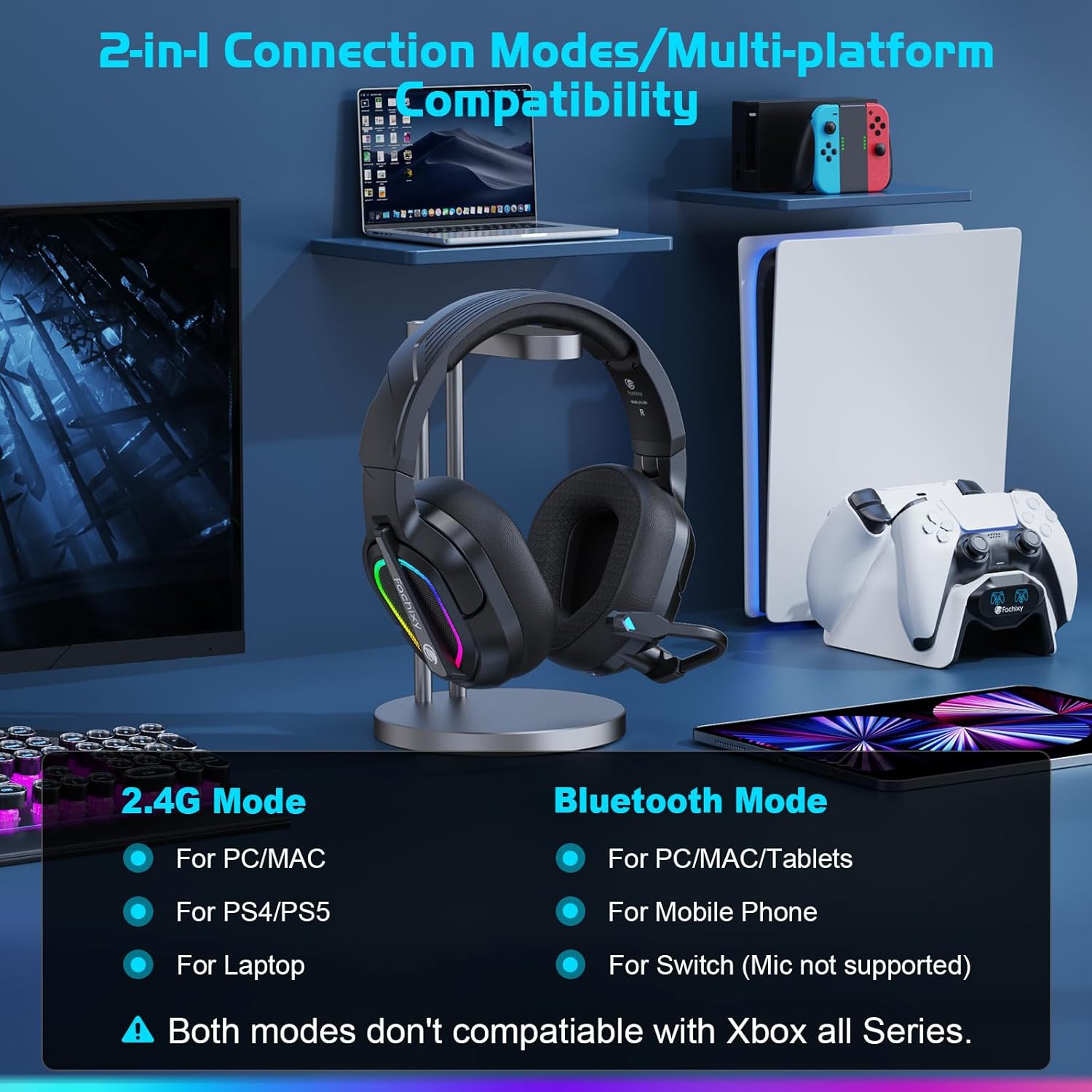 [2 Connection Modes & Multi-Devices Support] â‘  Enjoy seamless connectivity with the Fachixy wireless gaming headset via a 2.4GHz USB dongle, compatible with PC, PS4, PS5 and more controllers. â‘¡ Bluetooth mode of gaming headset is compatible with Switch (Mic not supported) and most mobile devices like smartphones, tablets, allowing seamless changing between different scenarios. NOTE: Both 2.4G and Bluetooth modes are NOT compatible with Xbox all Series.