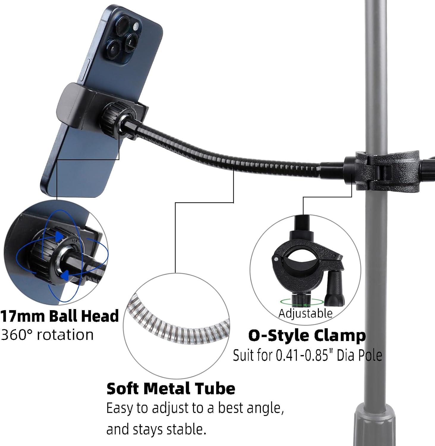 Secure & Stable Grip: Engineered with an O-clamp locking mechanism, this mic stand phone holder provides a strong, slip-resistant grip. It stays firmly in place even when adjusting your phone, ensuring stability during use.
