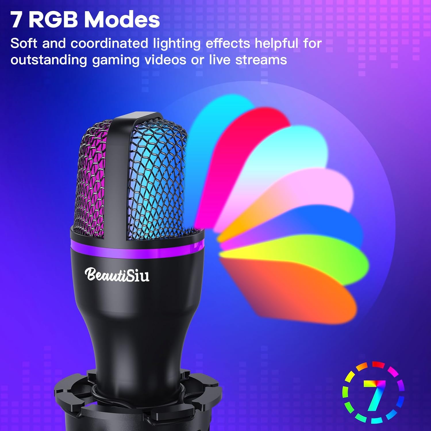 Product USB Condenser Microphone Compatible With Windows, Mac OS, Linus, PS4/5 Power Input Type USB, DC 5V Pick Up Type Cardioid Pick Up Suitable for Video Calls, Gaming, Podcasting, Conference Calls RGB Color 7 Colors Packages Microphone*1; Shock Mount *1; Tripod *1; Pop Filter *1; USB Power Cable *1; Pouch *1; Manual *1; Box *1