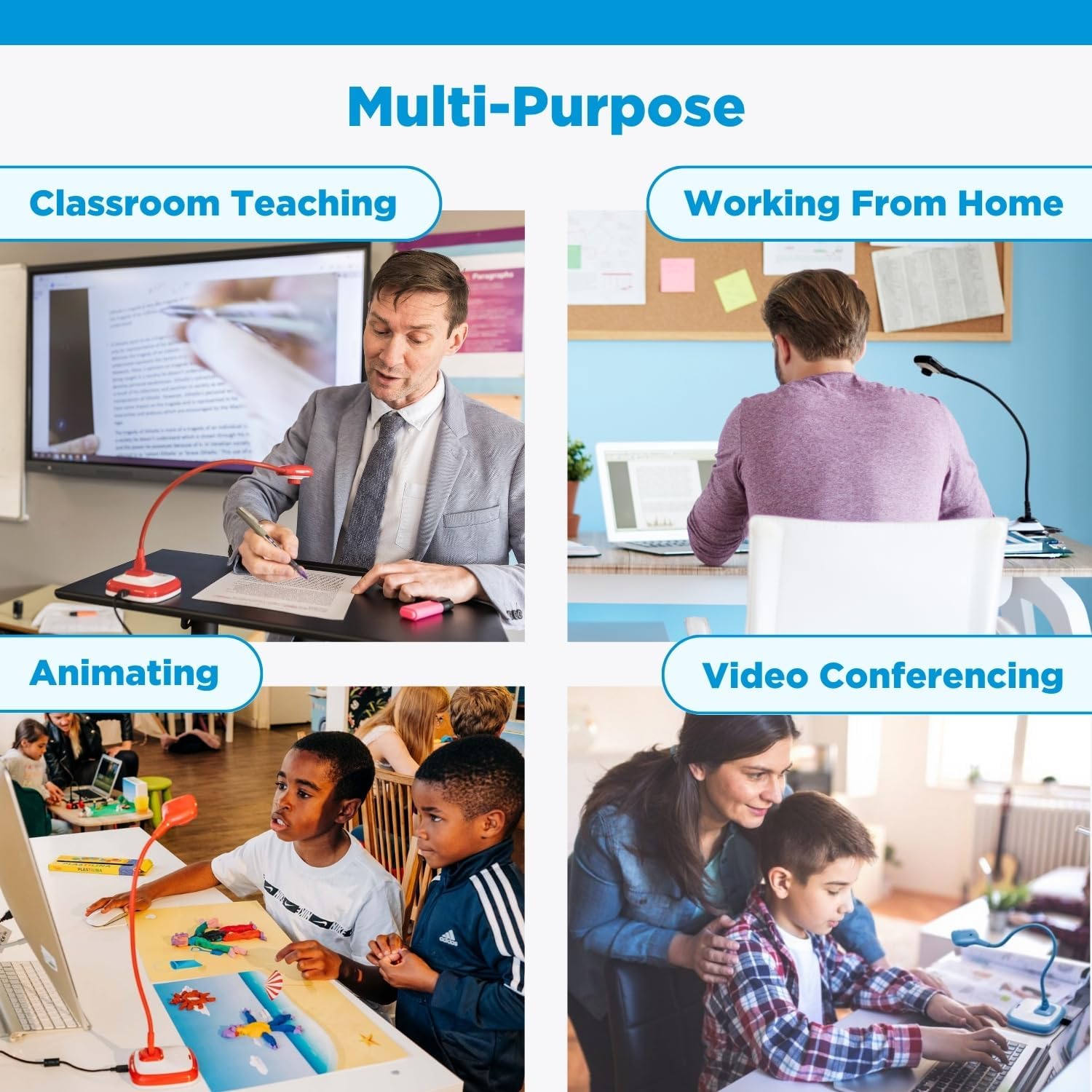 EASY TO USE without training, Plug & Play, compatible with native Windows, Chrome OS, macOS, Linux camera apps. Portable, lightweight, can be used without its base by plugging the flexible camera neck directly into a USB port or as a document camera in a classroom with interactive TVs and smartboards.
