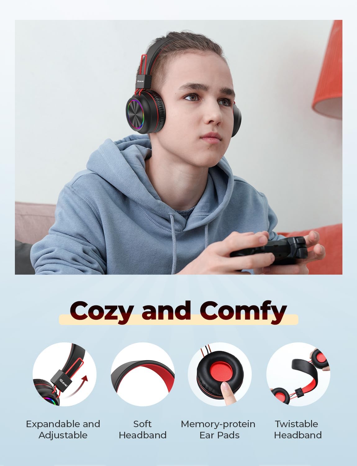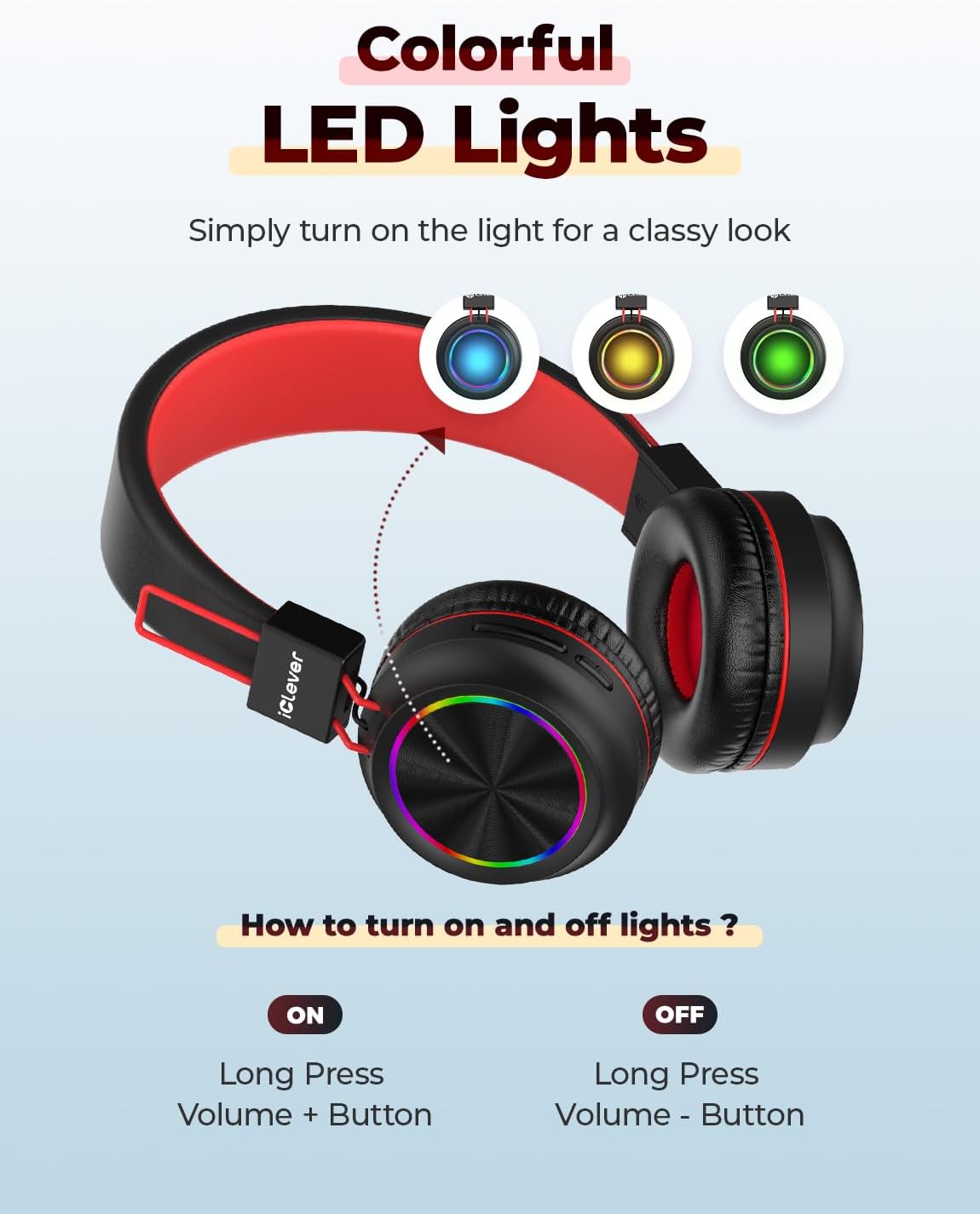 【Safe Volume & Colorful Lights】: Looks cool, sounds great! To protect kids’ hearing, the Kids headphones are limited to an output of 85dBA. In addition to the 40mm drivers that deliver full, immersive sound to the iClever kids Bluetooth headphones, they also feature a set of LED lights that run around the edges of the earpiece for an awesome, stylish look!