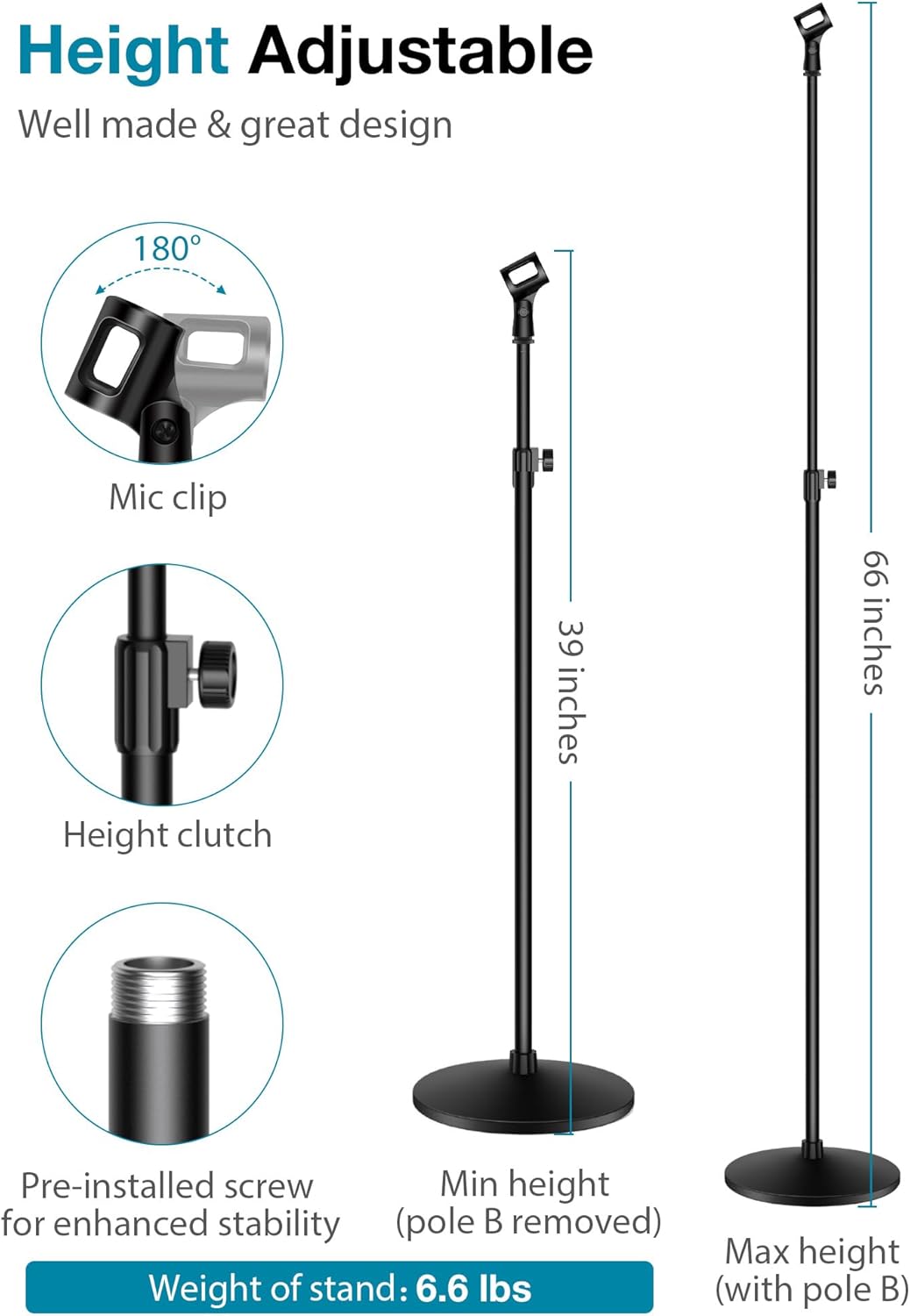 Heavy-duty Stability with Non-slip Base: Featuring a robust 4.6 lbs weighted round base with a 9.6-inch diameter, this microphone stand ensures solid and durable usage. The non-slip pads on the base provide extra stability, while a thickened gasket between the base and stand prevents any unwanted wiggle, ensuring your microphone remains securely in place during performances.