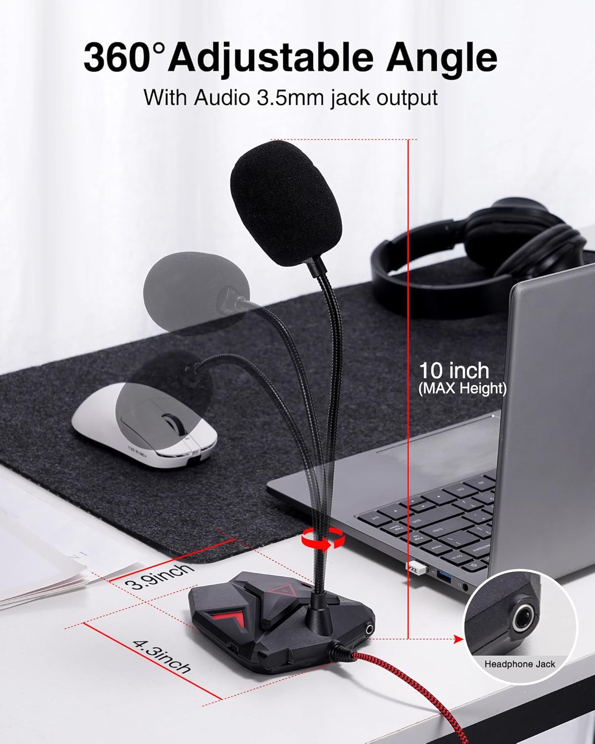 Design with 360°Adjustable Neck: Solid Construction Adopting premium metal pipe and heavy-duty ABS stand to make sure that you will be satisfied with our computer mic quality.