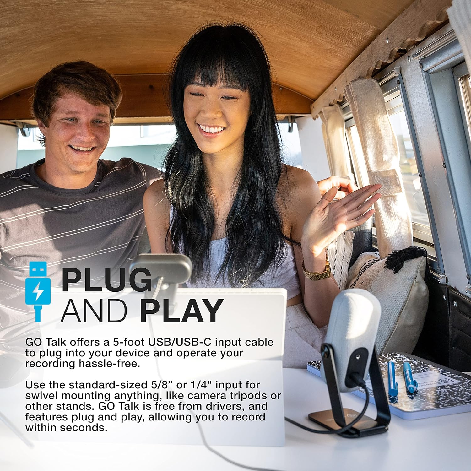 🎙️ PLUG AND PLAY: GO Talk offers a 5-foot USB/USB-C input cable to plug into your device and operate your recording hassle-free. Use the standard-sized 5/8” or 1/4″ input for swivel mounting anything, like camera tripods or other stands. GO Talk is free from drivers, and features plug and play, allowing you to record within seconds.