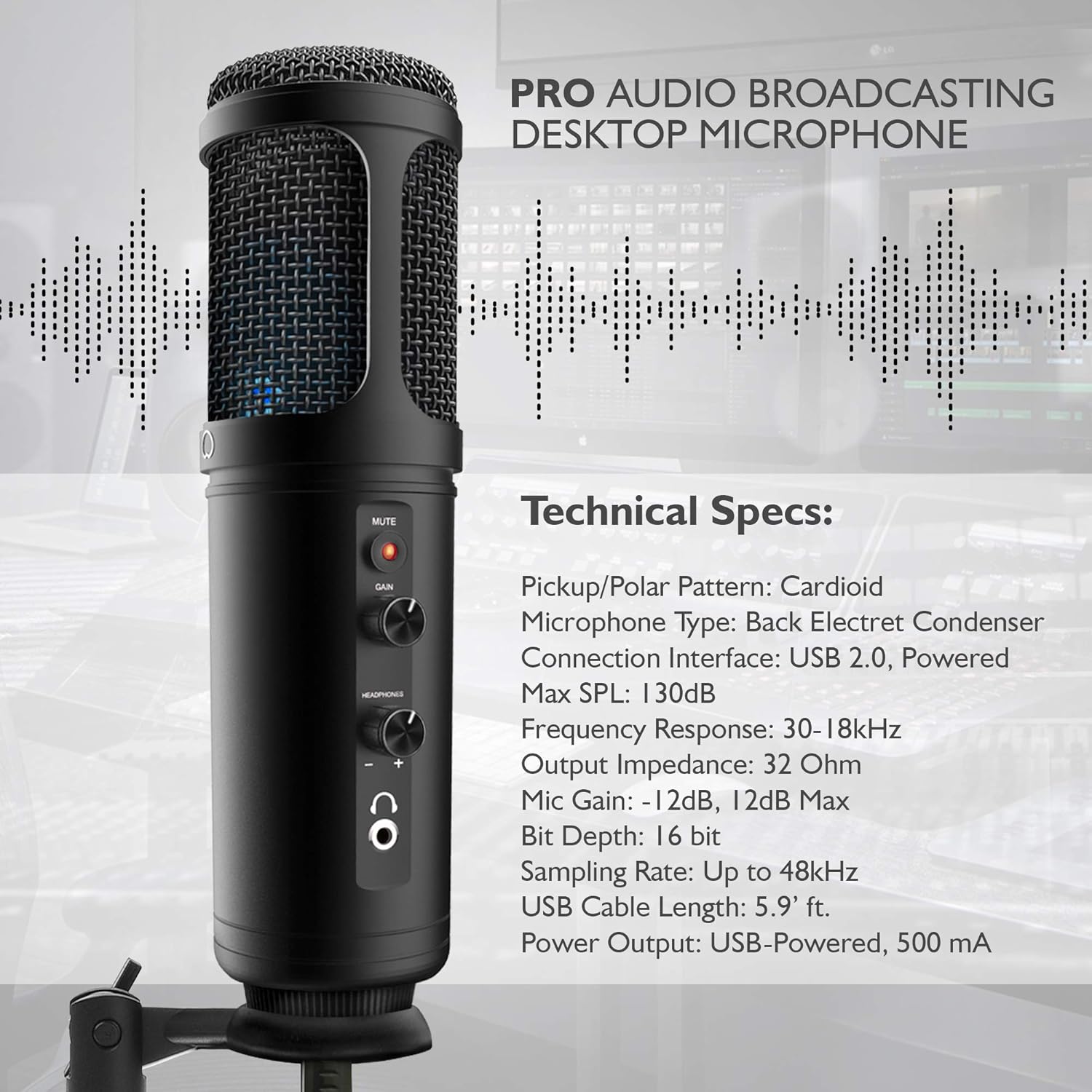 Features: – Pro Audio Broadcasting Desktop Microphone – Simple USB ‘Plug-and-Play’ Operation – Connects to Your Computer for Hassle-Free Sound Control – Used for Podcasts, Gaming, Streaming, Recording, Audio Editing – Lab Tested for Stage & Studio-Quality Performance – Crisp Vocal Pickup, High-Precision Audio Clarity – Convenient Mic Mute Button – Headphone Jack, 3.5mm – Adjustable Mic Volume & Headphone Volume Control – Freestanding Mic Placement on Any Desktop, Counter, Table – Compact & Portable Mic Style – Detachable USB Cable – Detachable Metal Tripod Mic Stand Mount – Universal Computer Compatibility: Works with PC, Mac, Linux – For Home, Office & Business Use What’s in the Box: – USB Microphone – Mic Clip Holder – Tripod Stand – USB Cable Technical Specs: – Pickup/Polar Pattern: Cardioid – Microphone Type: Back Electret Condenser – Connection Interface: USB 2.0, Powered – Sensitivity: -36dB +/- 2dB (0dB=1V/Pa at 1KHz) – Max SPL: 130dB – Frequency Response: 30-18kHz – Output Impedance: 32 Ohm – Mic Gain: -12dB, 12dB Max – Bit Depth: 16 bit – Sampling Rate: Up to 48kHz – Computer Operating System Support: Windows XP, Vista, 7, 8, 10, Mac OS X, Linux – Mic Stand Construction Material: Engineered Metal Alloy – USB Cable Length: 5.9’ ft. – Power Output: USB-Powered, 500 mA – Microphone Dimension: 7.2’’ x 2.2’’ x 2.0’’ – inches – Total Assembled Dimensions (L x W x H): 6.1‘‘ x 4.1‘‘ x 11.2‘‘ -inches