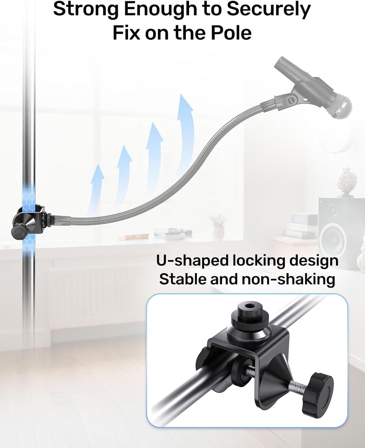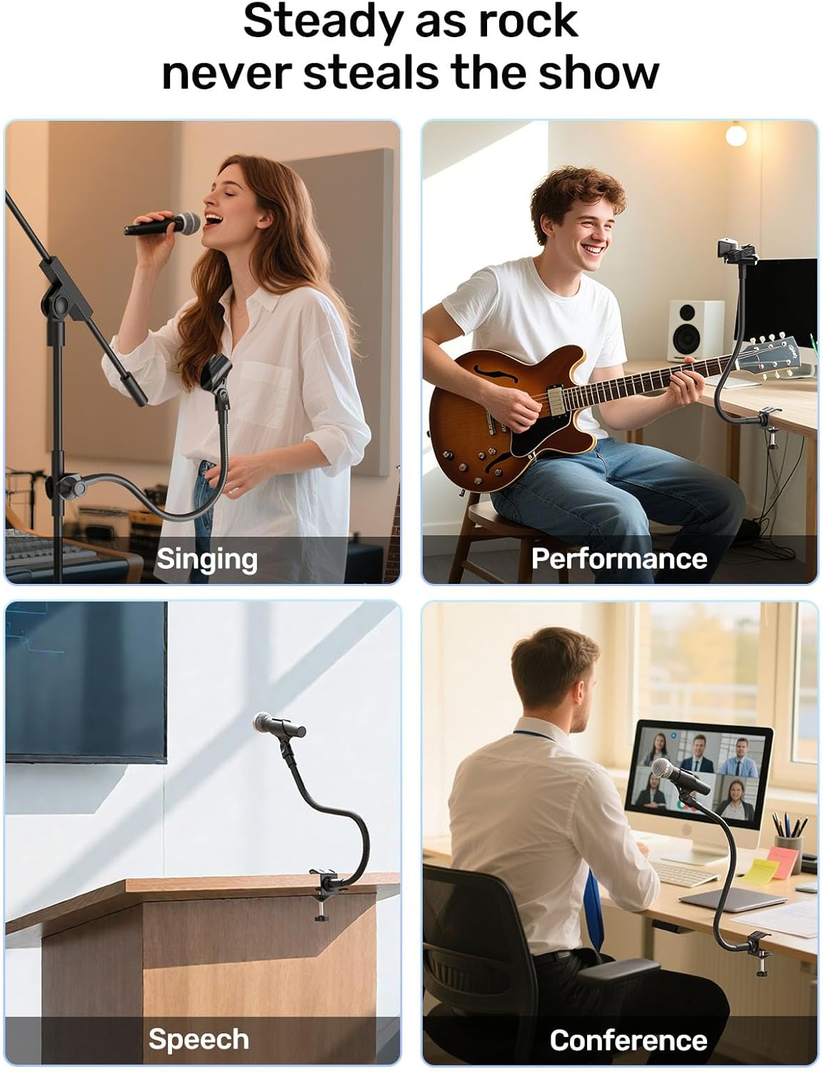 [Multi-Purpose Mic Clamp] The mic clamp clips the gooseneck stand to pianos for studio recordings, attach to floor stands for street performances, or mount the microphone holder on desks for conference calls and podcasts without taking up extra floor space.