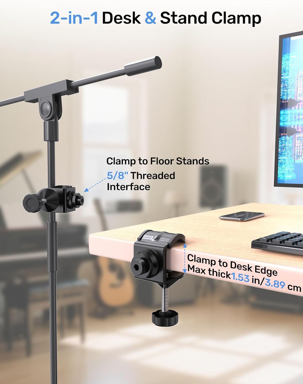 [Adjustable Mic Clamp Mount] Heavy-duty adjustable mic clamp fits desks and bracket poles up to 1.53″ thick, locking securely without tools.