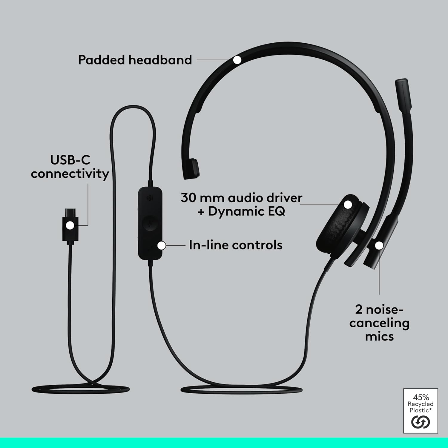• Logitech H570e USB Headset with Microphone for PC and Mac, USB-C Wired Headset with Mono Sound, Noise-Canceling Mics and Inline Controls, Certified for Microsoft Teams, Black