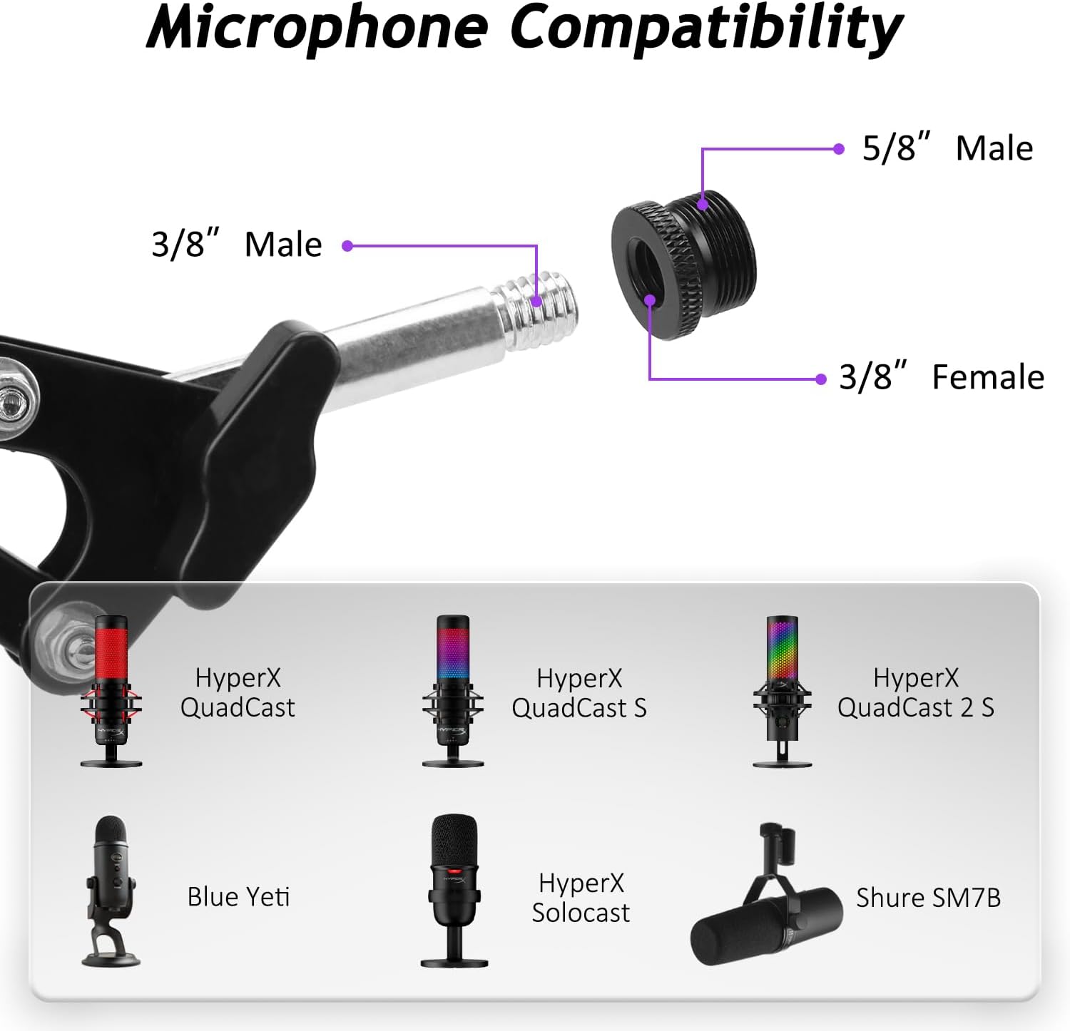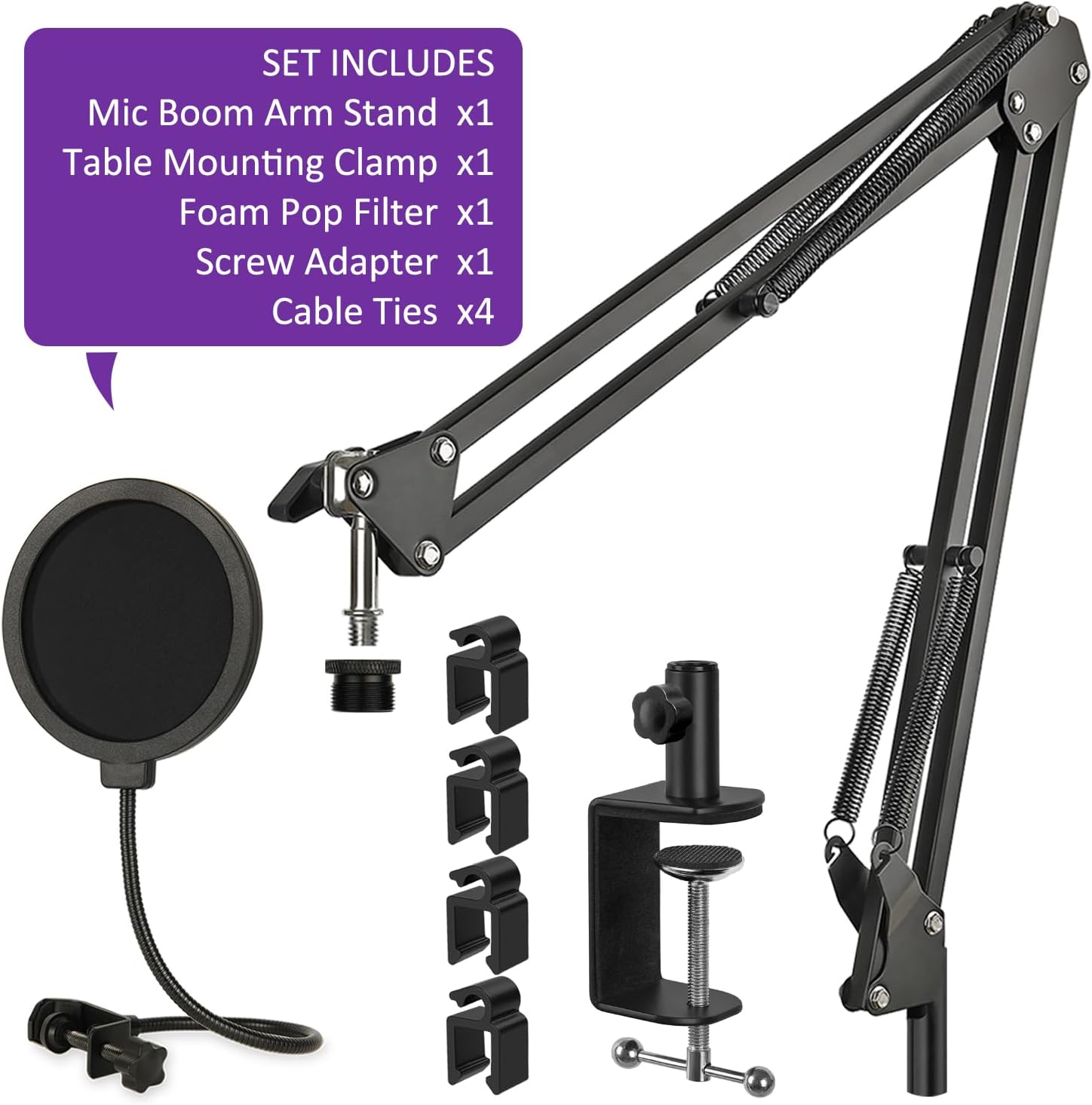 All-In-One – 1 Pcs desk mic stand, 1 Pcs foam pop filter, 1 Pcs table mounting clip, 4 Pcs cable ties and 1 Pcs 3/8 female to 5/8 male screw adapter. Note: Not included mic.
