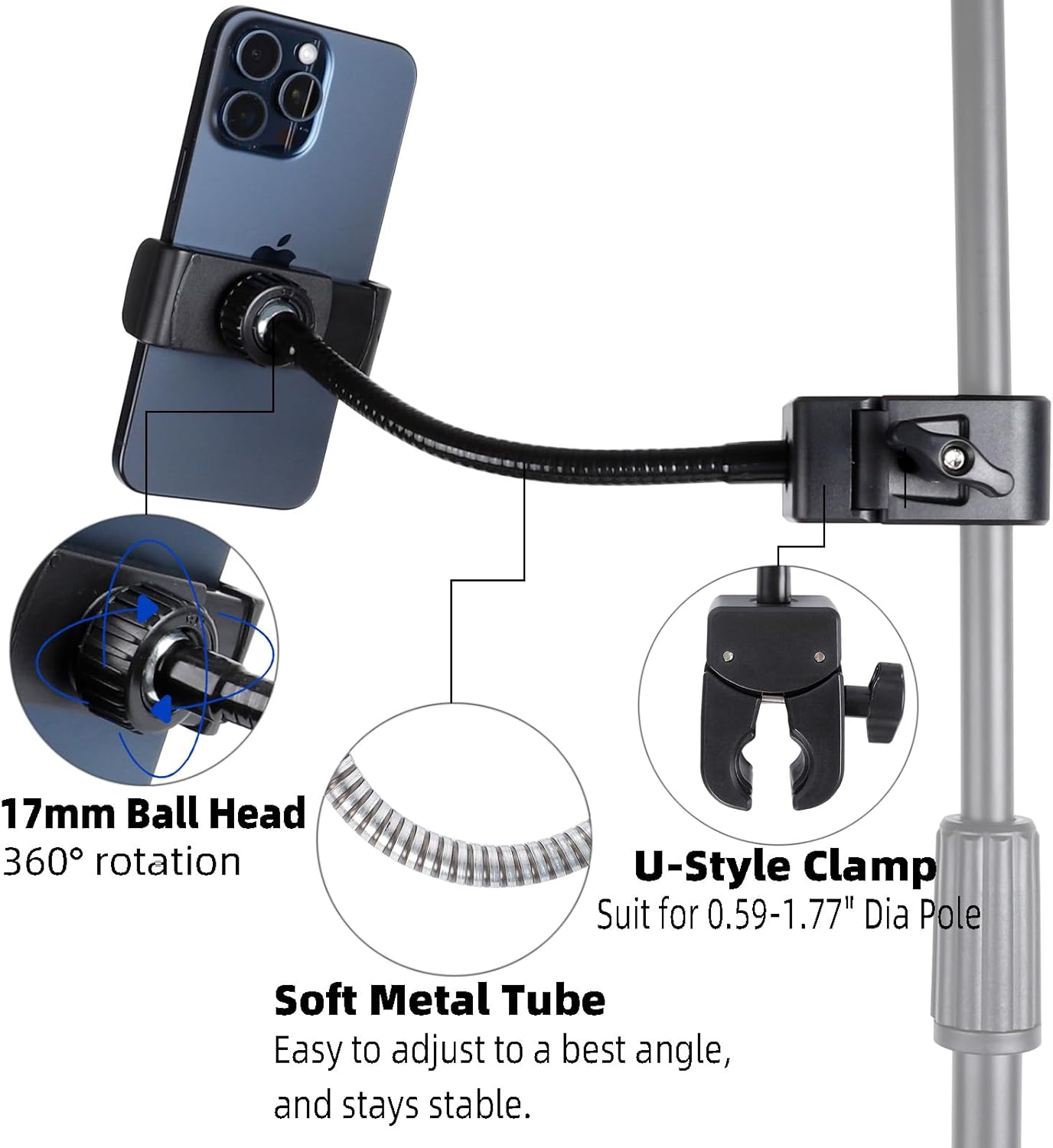 **Flexible Gooseneck Design**: Featuring a 7.9″ removable gooseneck, this flexible phone mount easily bends and twists to your desired angle. This allows you to view lyrics, music arrangements, or record videos at any perspective, enhancing your performance experience.