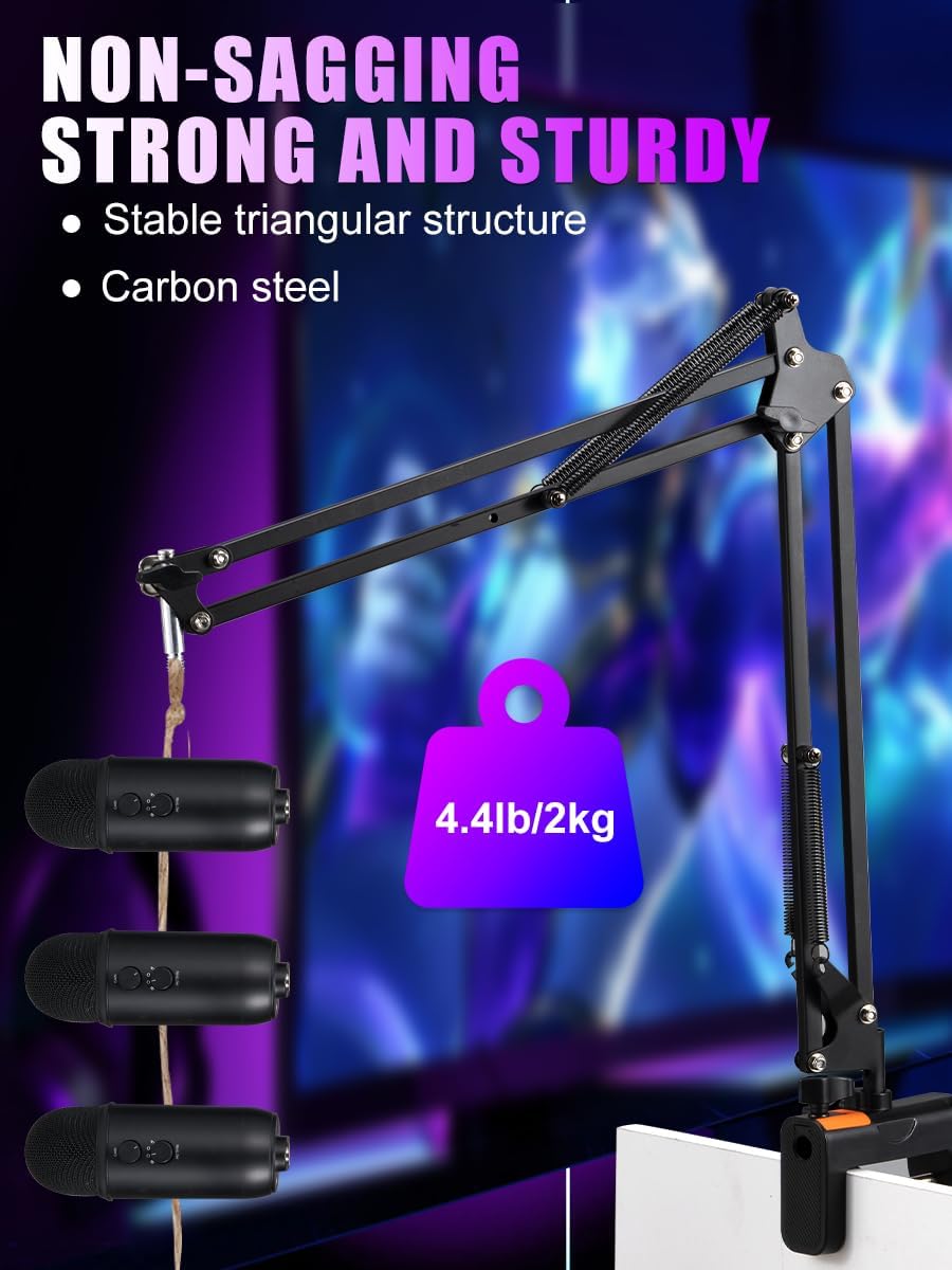Adjustable and Flexible Mic Arm:The mic arm stand is fully adjustable, featuring 360° base rotation and 180° arm movement for precise mic positioning. It’s super stable and can hold microphones up to 4.4 pounds (2 kilograms) without any sagging. Perfect for podcasts, live streaming, and recording. The arm is easy to install and fold, and can be conveniently tucked away when not in use, making it great for users with limited space