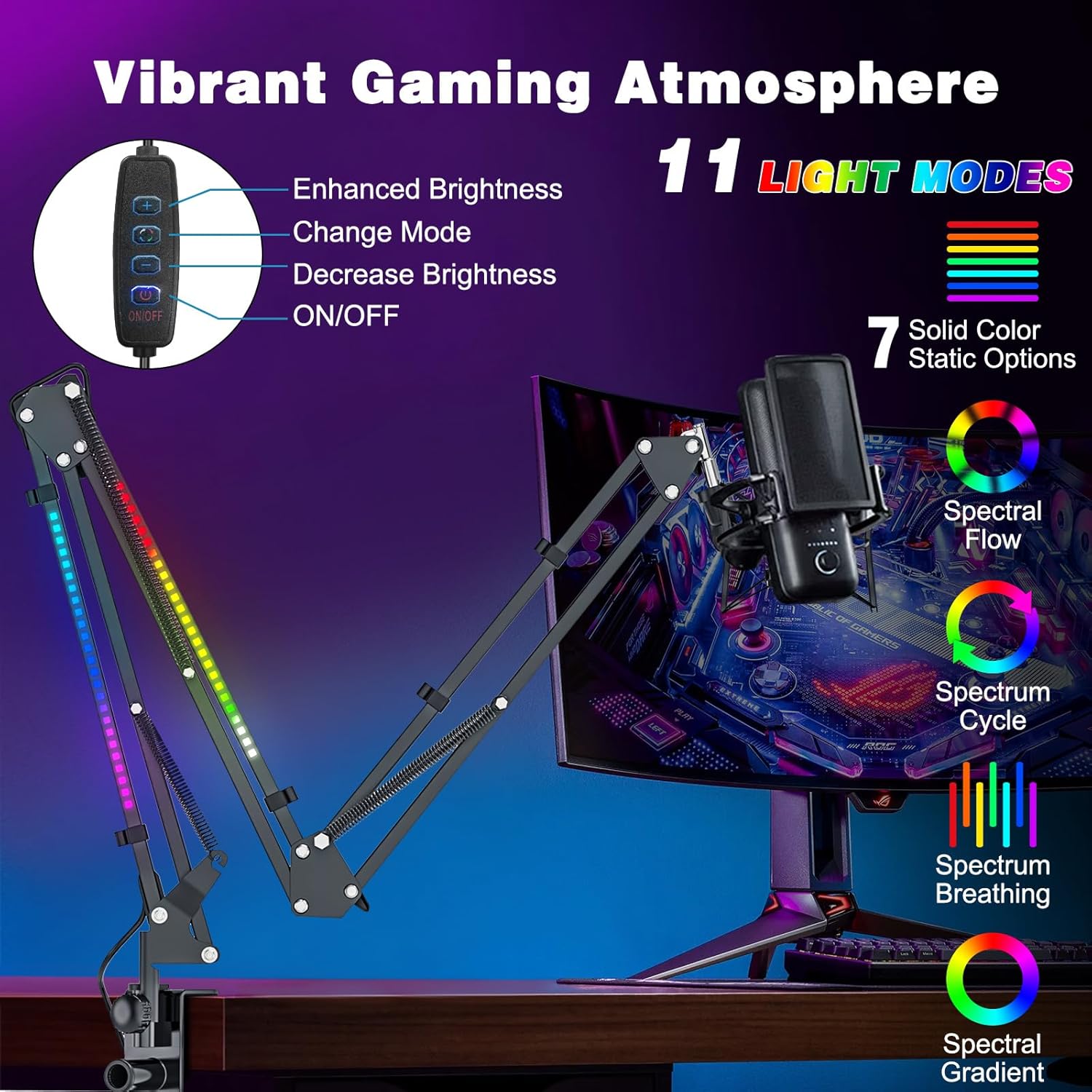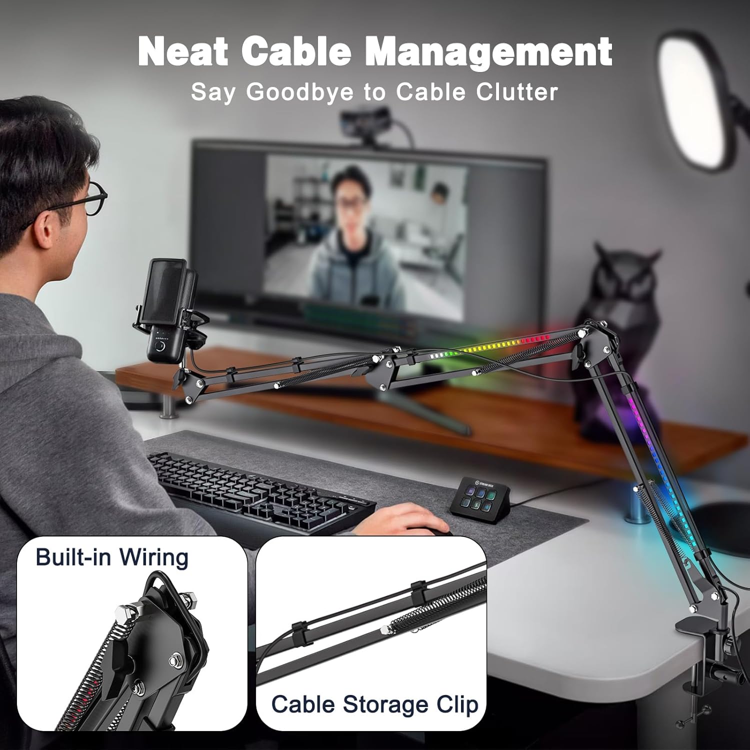 【11 Lighting Modes & 10 Brightness Levels】This microphone boom arm offers 11 meticulously designed lighting modes and 10 preset brightness levels, ranging from 10% to 100% brightness, to easily create a personalized lighting atmosphere. With just a quick press, you can turn it on/off, switch between modes, or adjust brightness. The included 1.5meter (59inches) control cable keeps lighting adjustments right at your fingertips.