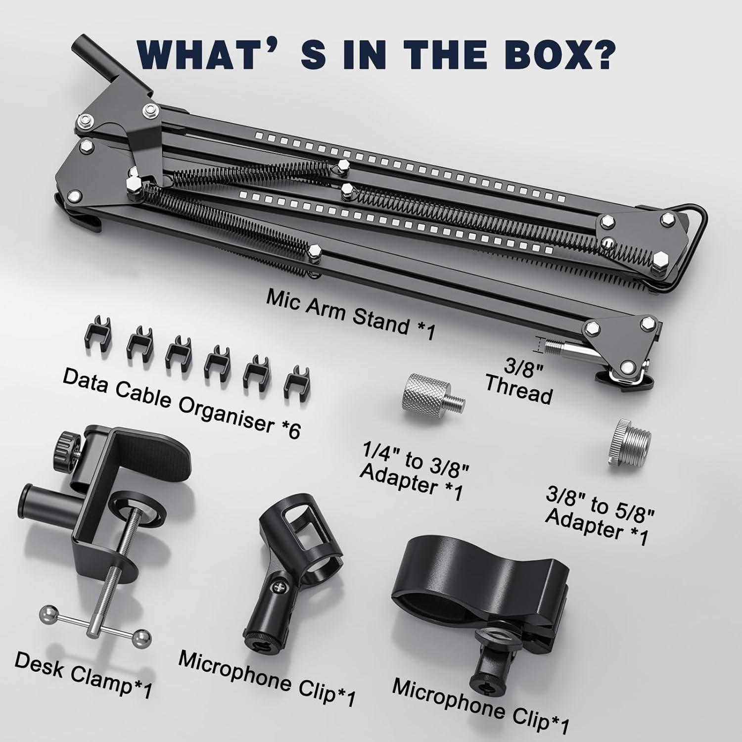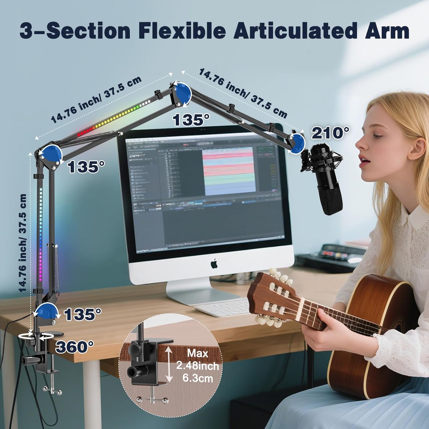 【Dazzling RGB Microphone Stand】This innovatively designed microphone arm stand has a built-in RGB lighting system that provides 11 professional lighting modes (7 static + 4 dynamic). Its cool RGB light performance energizes different creative environments, especially for professional scenarios such as live gaming, ASMR recording, short video production (YouTube/Facebook/TikTok/Instagram), music recording, broadcasting and podcasting, etc., which dramatically improves the quality of visual atmosphere.