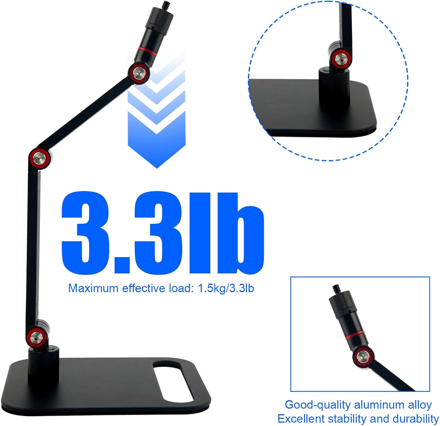Product Material: The microphone stand is made of good-quality aluminum alloy, reliable, hard, and has a maximum load of 1.5kg/3.3lb. It is not easy to be damaged or deformed, and you can use it for a long time without worry.