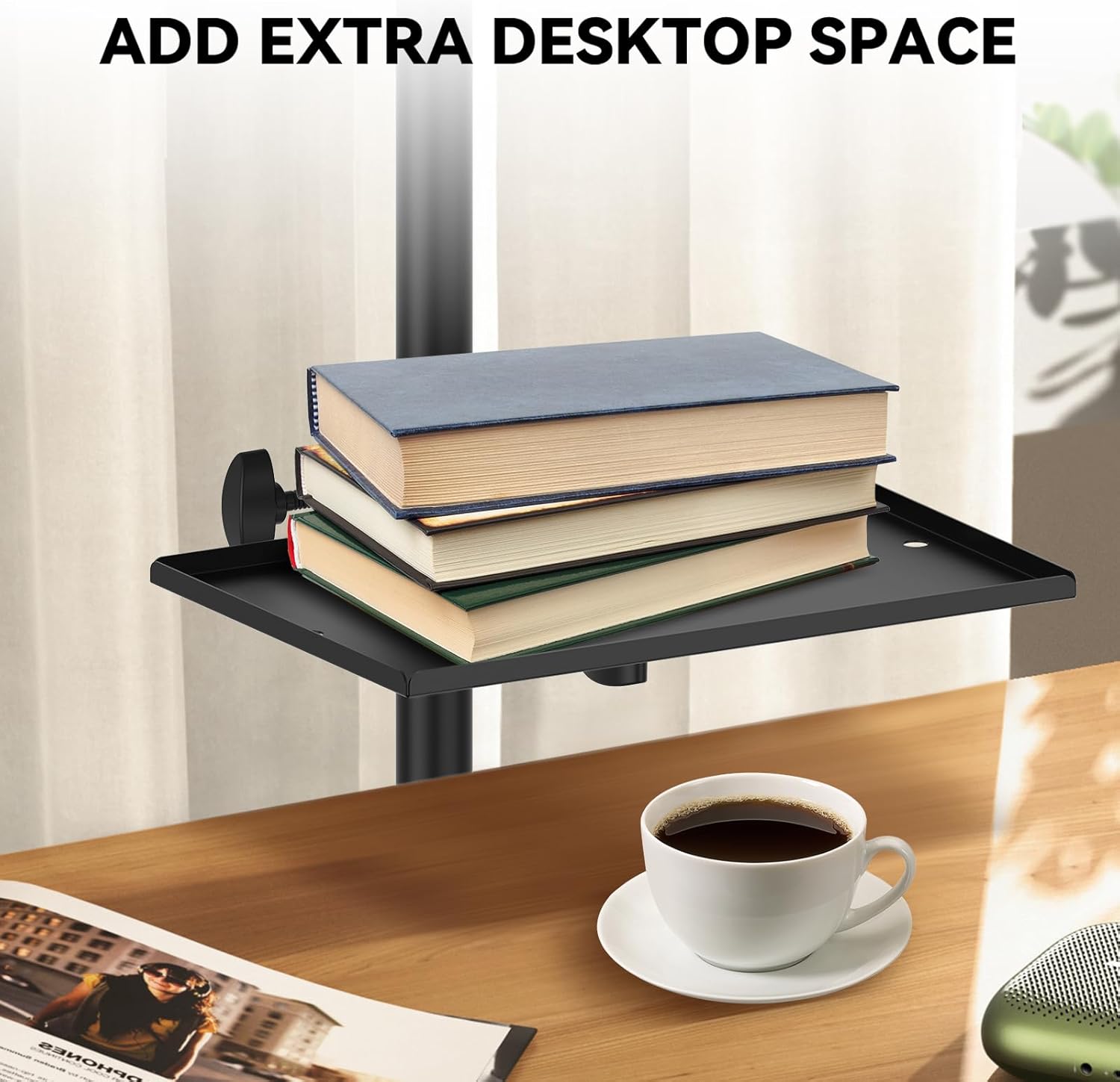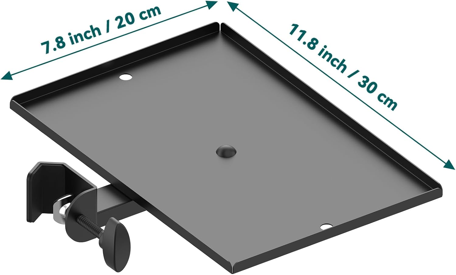 Mic stand tray measures 11.8″x7.8″ (30×20 cm). The tray has edges to prevent items from accidentally falling.