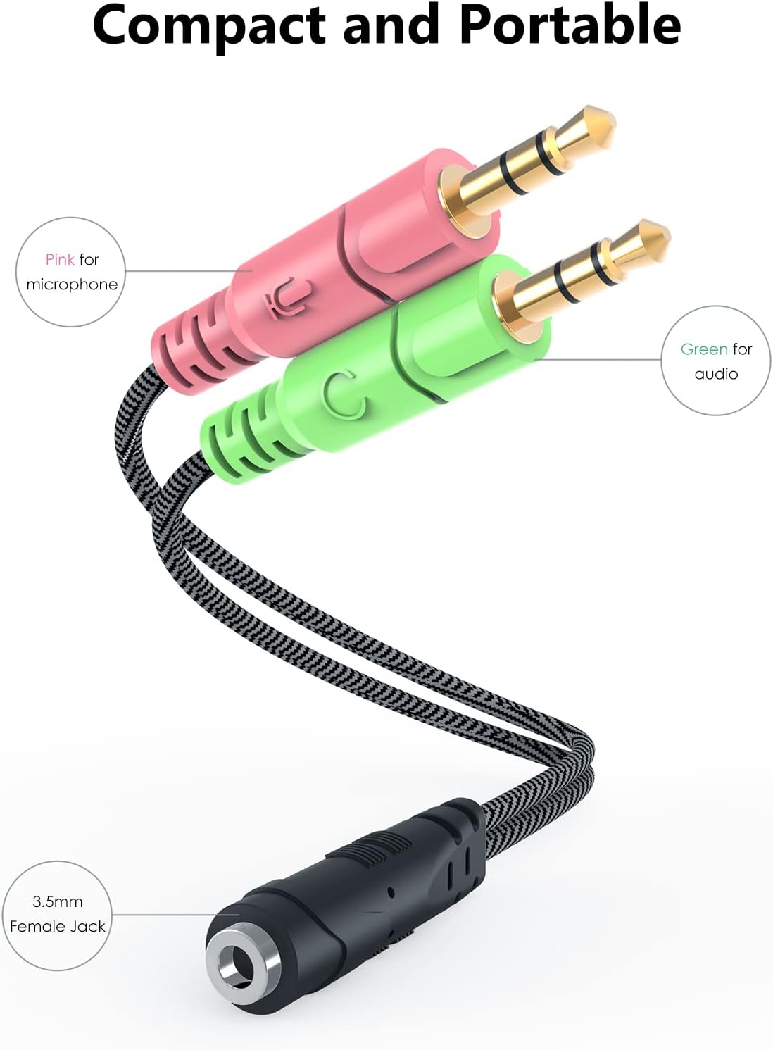 This 3.5mm Headphone Splitter for Computer equipped with Gold-plated connectors ensures optimum sound quality. And bending resistance provides sufficient durability. Compact, yet robust design for maximum portability.