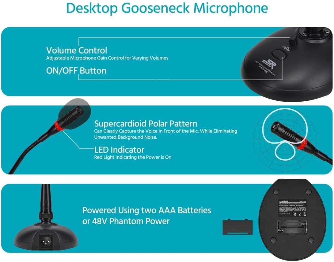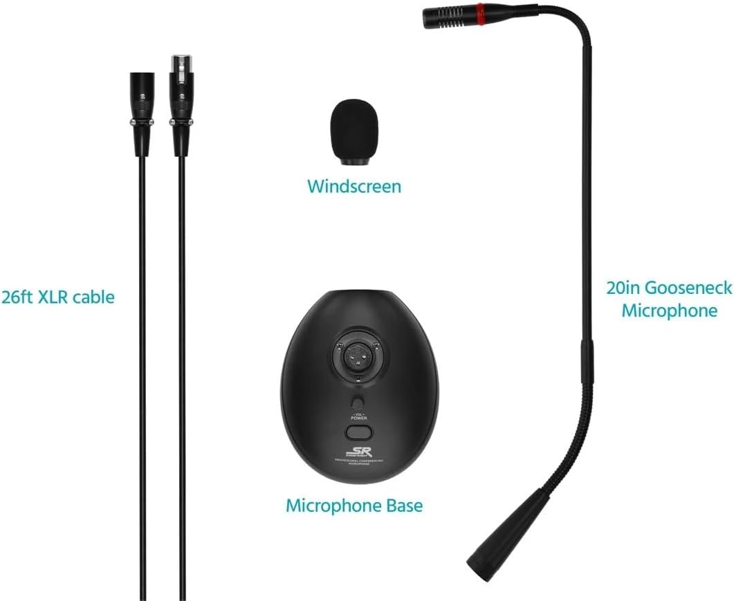 The Stage Right Professional Conferencing Supercardioid Condenser Microphone is expertly engineered to deliver crystal-clear sound for meetings, speeches, broadcasts, and recordings. Featuring a flexible metal gooseneck and a durable plastic base with a touch-sensitive power switch, these features allow for precise positioning and easy control. The supercardioid polar pattern captures your voice with pinpoint accuracy while minimizing background noise, ensuring your words are delivered with clarity and warmth in any environment—from conference rooms to live broadcasts. This versatile microphone offers a wide frequency range of 20Hz to 20kHz and is powered by either AAA batteries or +48V phantom power. With an impressive dynamic range of 110dB and a signal-to-noise ratio of 69dB, it ensures your voice comes through loud and clear without distortion. The microphone’s balanced 68-ohm output impedance and its removable foam pop filter further enhance sound quality by reducing unwanted noise. Included with the microphone is everything you need for a professional-grade audio setup: a 26-foot XLR cable, an XLR-to-¼-inch TS adapter, and a sturdy and removable foam pop filter. The 16.14-inch (410-millimeter) microphone length and its lightweight 1.76-pound (0.8-kilogram) design make it an easy addition to any setup, whether mounted on its base or plugged directly into a mixer or PA system.