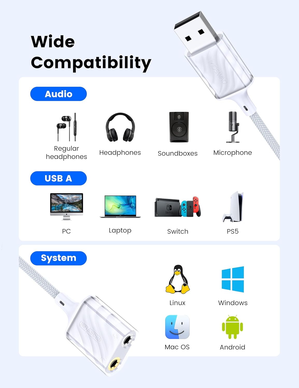 【Plug and play】USB bus-powered, no external power required! The MOSWAG USB Audio Splitter is true plug-and-play. Simply connect it to your device and immediately enjoy enhanced audio. Whether you’re a pro or a casual user, this sound card offers effortless setup and instant gratification.