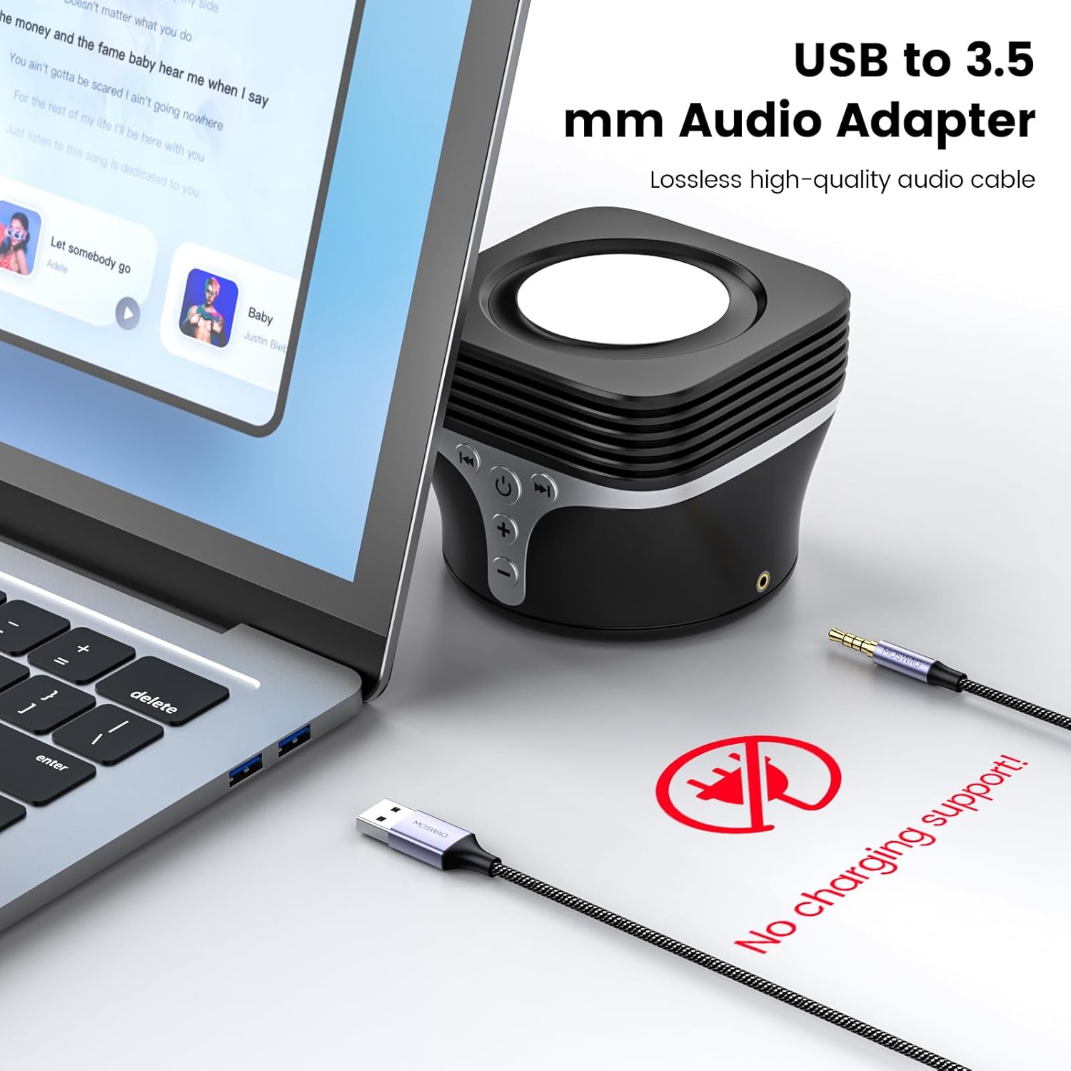 【Plug and Play】This USB audio cable is ideal for replacing a faulty sound card or audio port. It makes it easy to add a 3.5mm auxiliary port (audio out connector) to your device. Suitable for any device with a standard 3.5mm audio jack, plug the USB port into your computer and the computer will convert to an audio cable. Simple USB connection, no additional drivers required. Note: Recording and charging are not supported.
