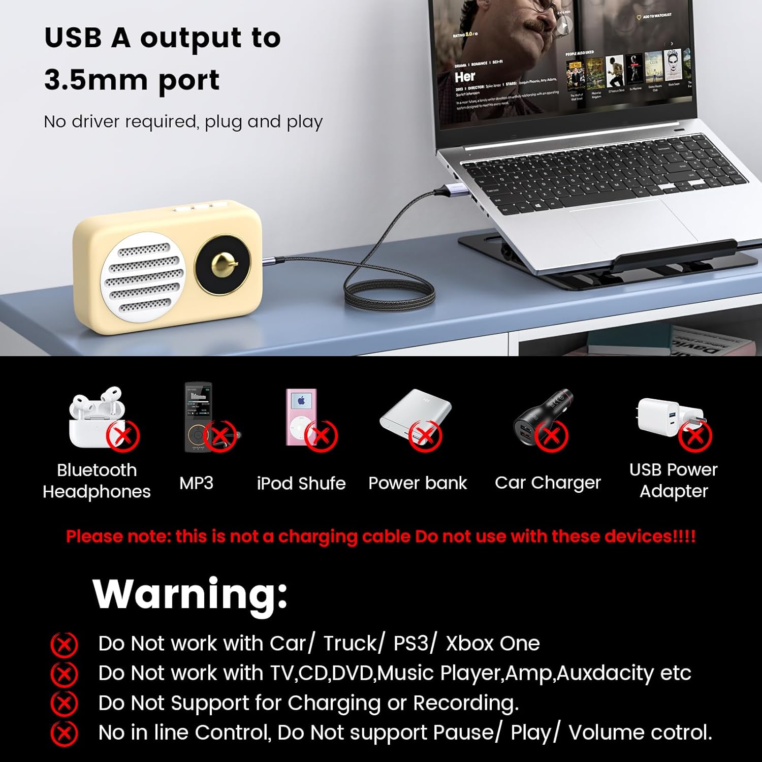 【❌Note】❌This cable only could be used as USB input signal to 3.5mm output audio. Not both dual ends could play sound. USB cannot play sound caused it is the input end. Only one usage: USB input sound signal, 3.5mm output sound❌