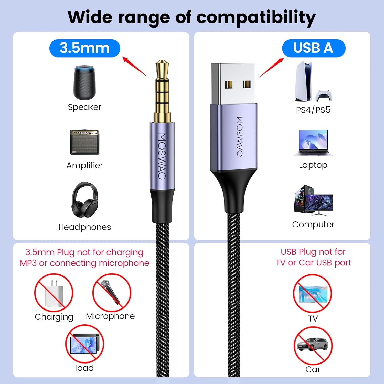 • MOSWAG USB to 3.5mm TRRS Audio Jack Adapter with Microphone, USB Male to 3.5mm AUX Stereo Audio Cable, Nylon Braided AUX Converter for PC, Laptop, Windows, Headphones(No Charging Support)