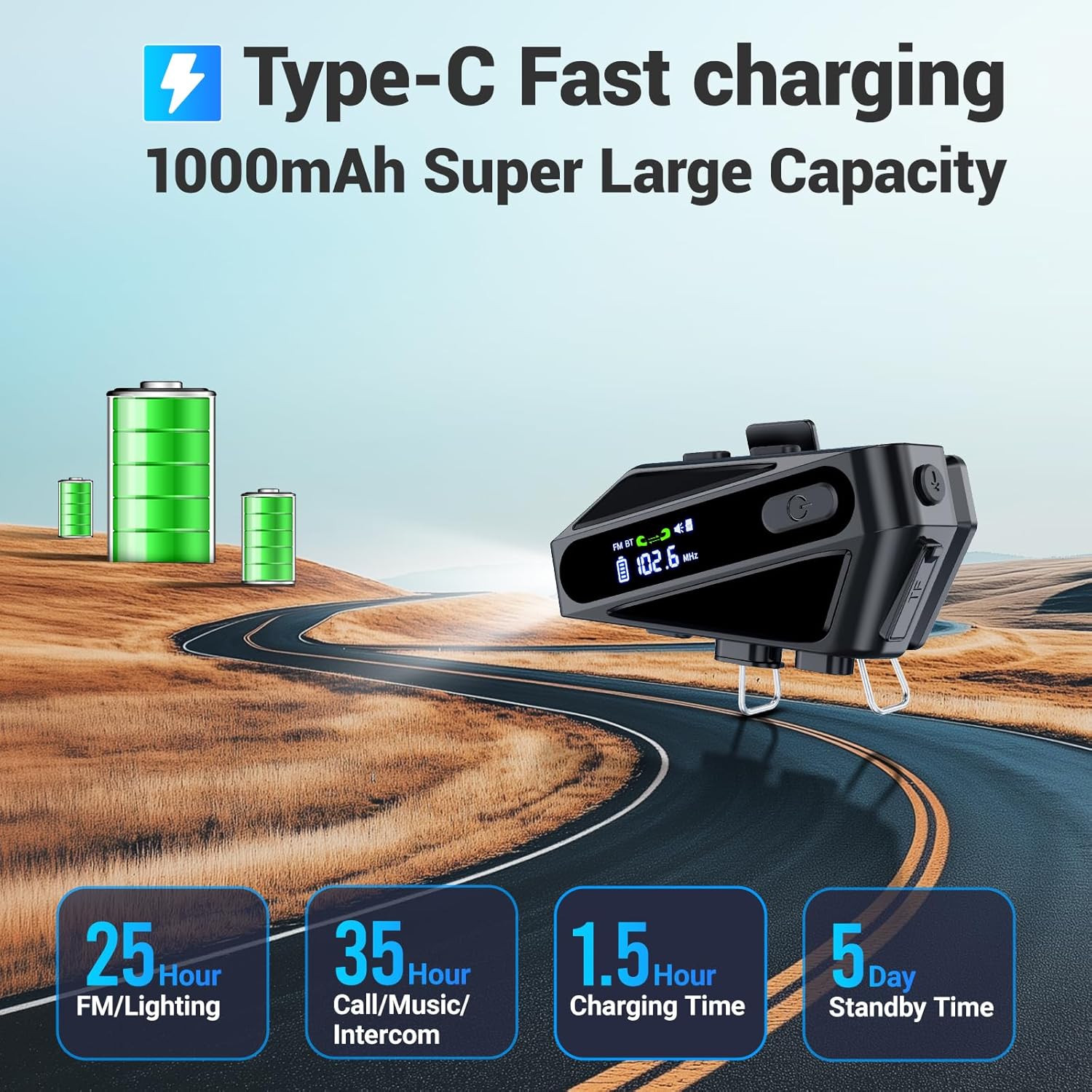 1000 mAh Longer Battery Life: Bluetooth motorcycle helmet With an 1000mAh lithium-ion battery and Type-C fast charging, 25-35 hours of music Share/call/intercom and music, 120 hours of standby, and the helmet headset takes only 1.5 hours to fully charge, ensuring that you’ll have continuous use throughout the day.