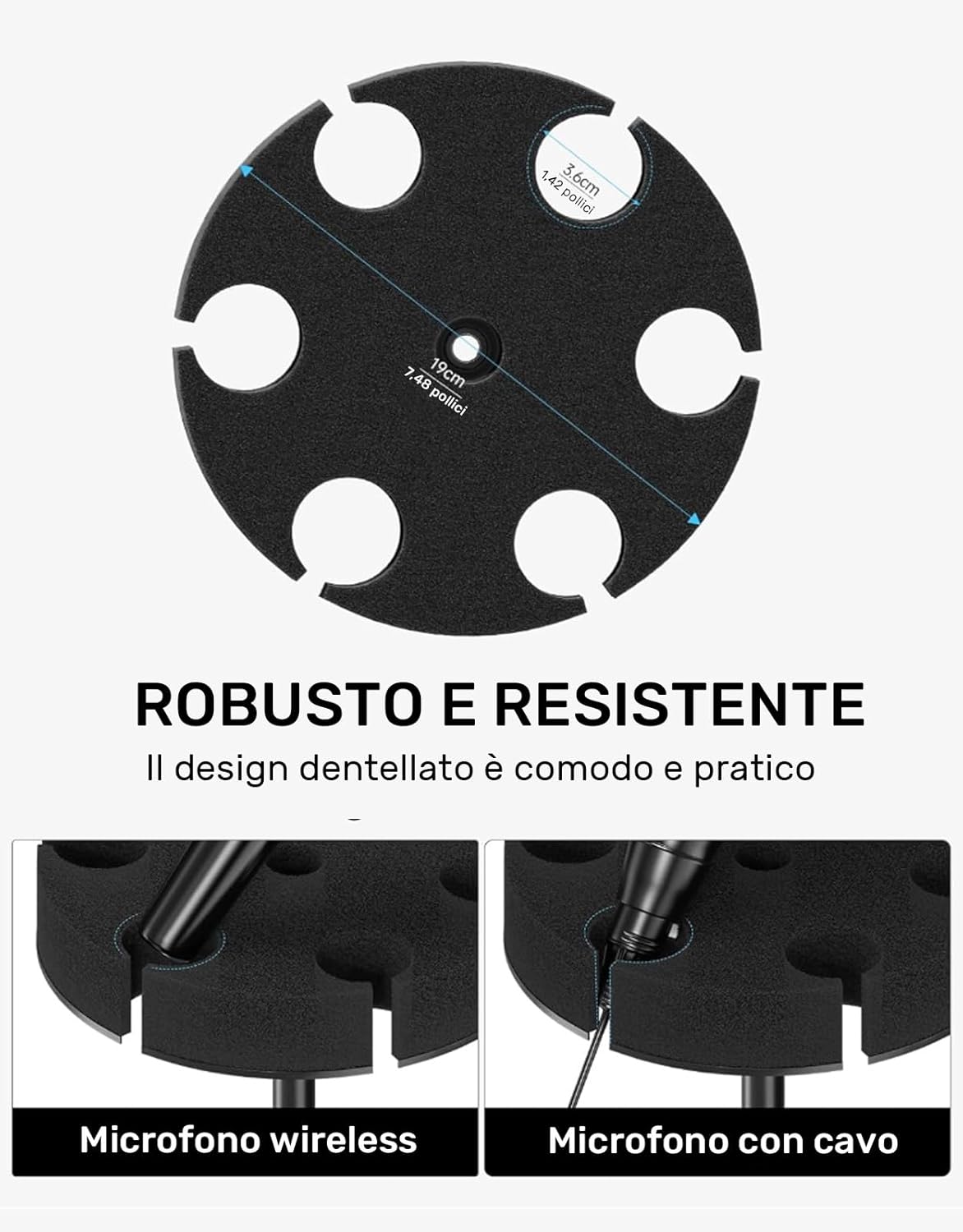 【IDEAL FOR WIRED OR WIRELESS MICS】The distinctive round design effortlessly accommodates handheld, dynamic, wired, or wireless mics, allowing for easy visibility and quick interchangeability.