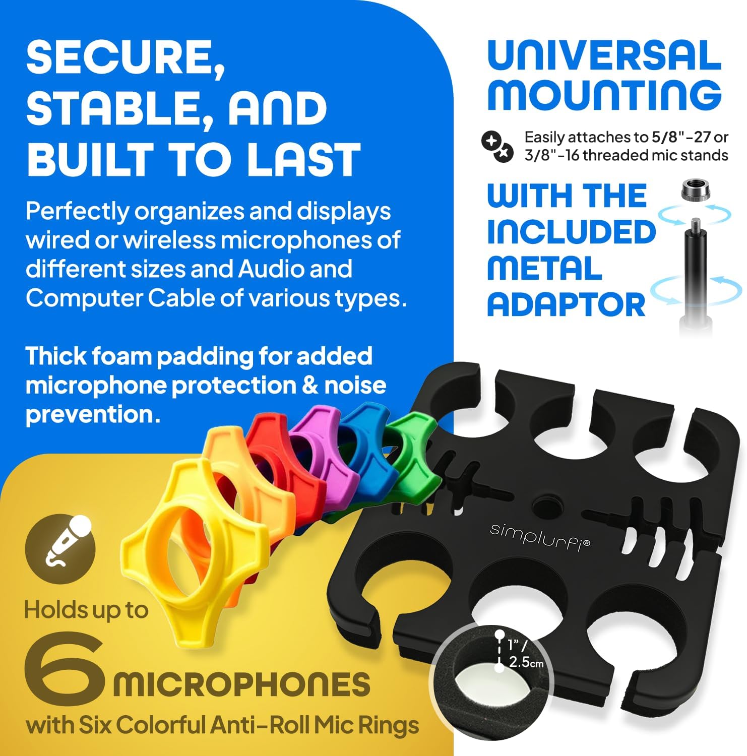 • Multi Microphone Holder Cable Hanger & Organizer with Desktop Mic Stand – Square Tray Attachment holds up to 6 mics On Stage Organizer and Display – 6 Anti-roll Rings Included