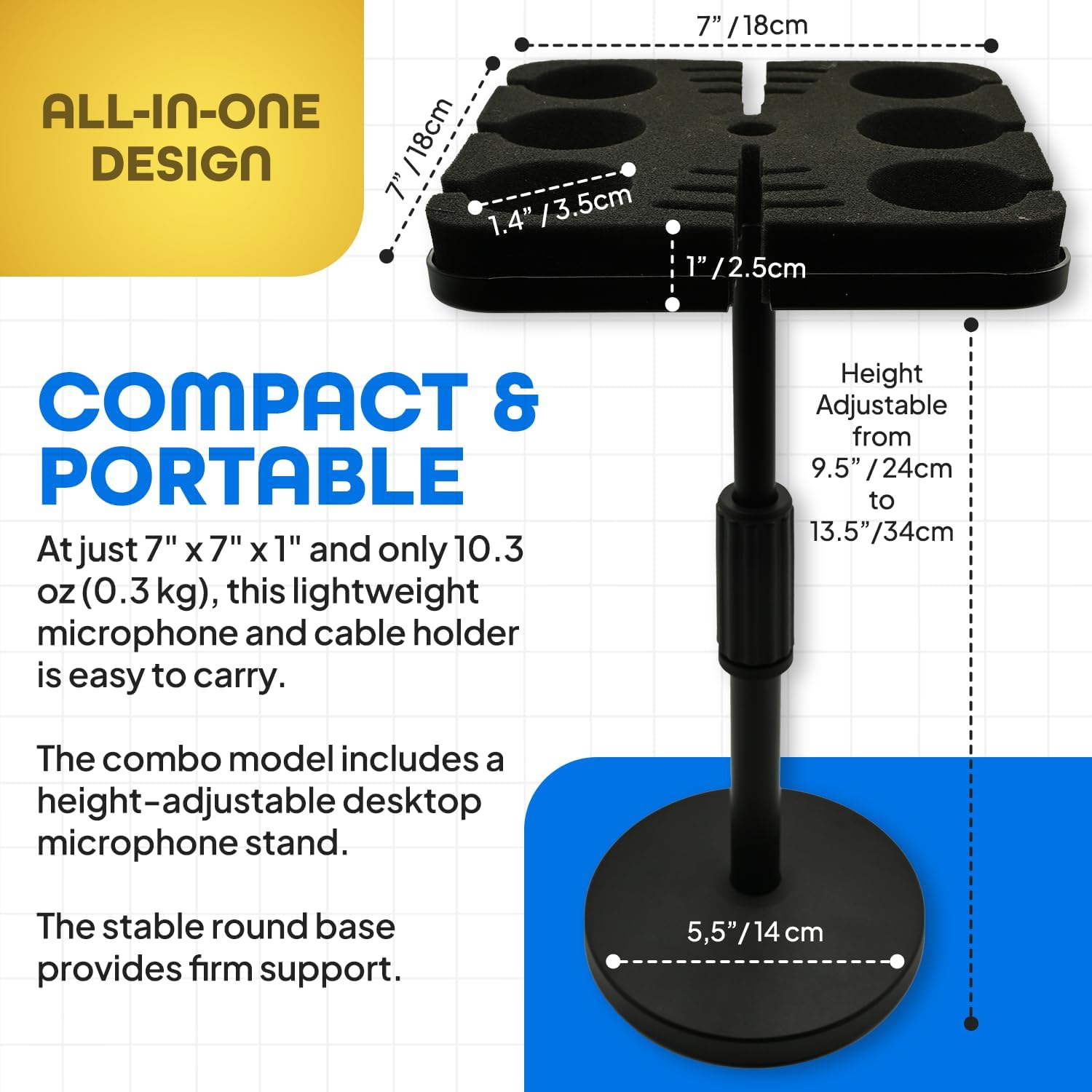 ✅【PORTABLE】🎤Lightweight and easy to carry, this multi-mic holder has dimensions of 7″ x 7″ x 1″ (18 cm x 18 cm x 2.54 cm). Weight: 10.3 oz (0.3 kg)