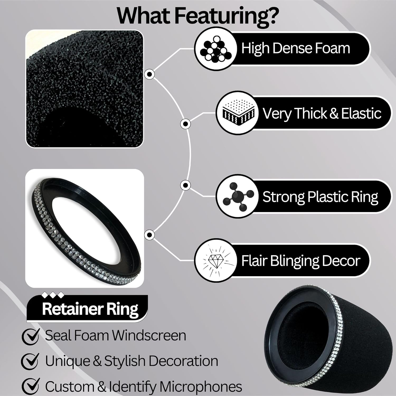 MV7 Pop Filter Replace for Shure MV7, MV7i, MV7+, MV7X, Microphone Windscreen Cover, Black with Sparkly Retainer Ring